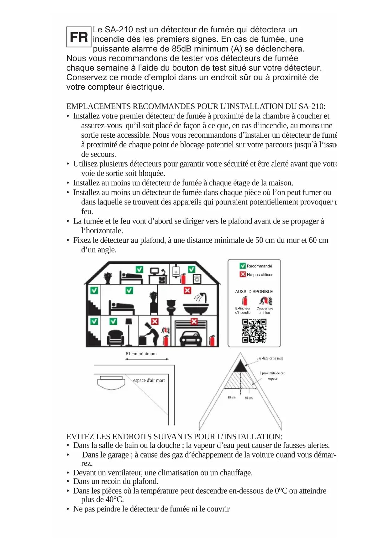 Le SA-210 est un détecteur de fumée qui détectera un incendie dès les premiers signes. En cas de fumée, une puissante alarme de 85dB minimum (A) se déclenchera.