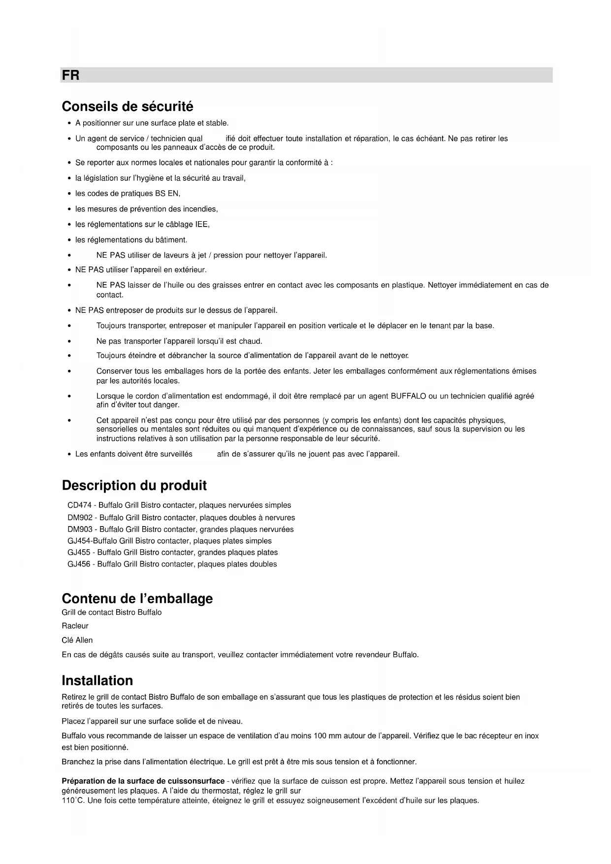 - Les enfants doivent être surveillés afin de s’assurer qu’ils ne jouent pas avec l’appareil. Description du produit CD474 - Buffalo Grill Bistro contacter, plaques nervurées simples DM902 - Buffalo Grill Bistro contacter, plaques doubles à nervures DM903 - Buffalo Grill Bistro contacter, grandes plaques nervurées GJ454-Buffalo Grill Bistro contacter, plaques plates simples GJ455 - Buffalo Grill Bistro contacter, grandes plaques plates GJ456 - Buffalo Grill Bistro contacter, plaques plates doubles Contenu de l’emballage Grill de contact Bistro Buffalo Racleur Clé Allen En cas de dégâts causés suite au transport, veuillez contacter immédiatement votre revendeur Buffalo. Installation Retirez le grill de contact Bistro Buffalo de son emballage en s’assurant que tous les plastiques de protection et les résidus soient bien retirés de toutes les surfaces. Placez l’appareil sur une surface solide et de niveau. Buffalo vous recommande de laisser un espace de ventilation d’au moins 100 mm autour de l’appareil. Vérifiez que le bac récepteur en inox est bien positionné. Branchez la prise dans l’alimentation électrique. Le grill est prêt à être mis sous tension et à fonctionner. Préparation de la surface de cuissonsurface - vérifiez que la surface de cuisson est propre. Mettez l’appareil sous tension et huilez généreusement les plaques. A l’aide du thermostat, réglez le grill sur 110˚C. Une fois cette température atteinte, éteignez le grill et essuyez soigneusement l’excédent d’huile sur les plaques.Standard d’assistance téléphonique : 08 20 30 01 16