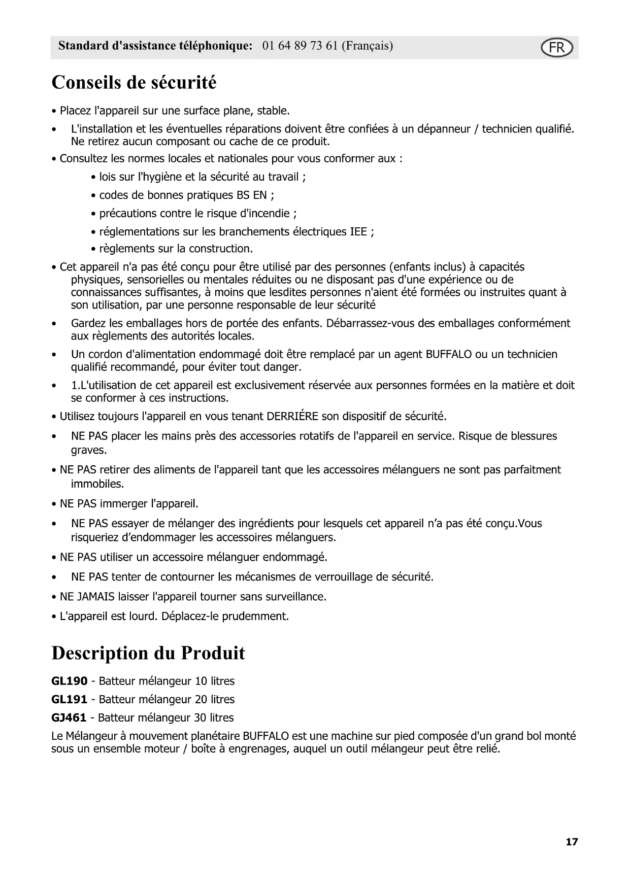 - L'appareil est lourd. Déplacez-le prudemment. Description du Produit GL190 - Batteur mélangeur 10 litres GL191 - Batteur mélangeur 20 litres GJ461 - Batteur mélangeur 30 litres Le Mélangeur à mouvement planétaire BUFFALO est une machine sur pied composée d'un grand bol monté sous un ensemble moteur / boîte à engrenages, auquel un outil mélangeur peut être relié.18
