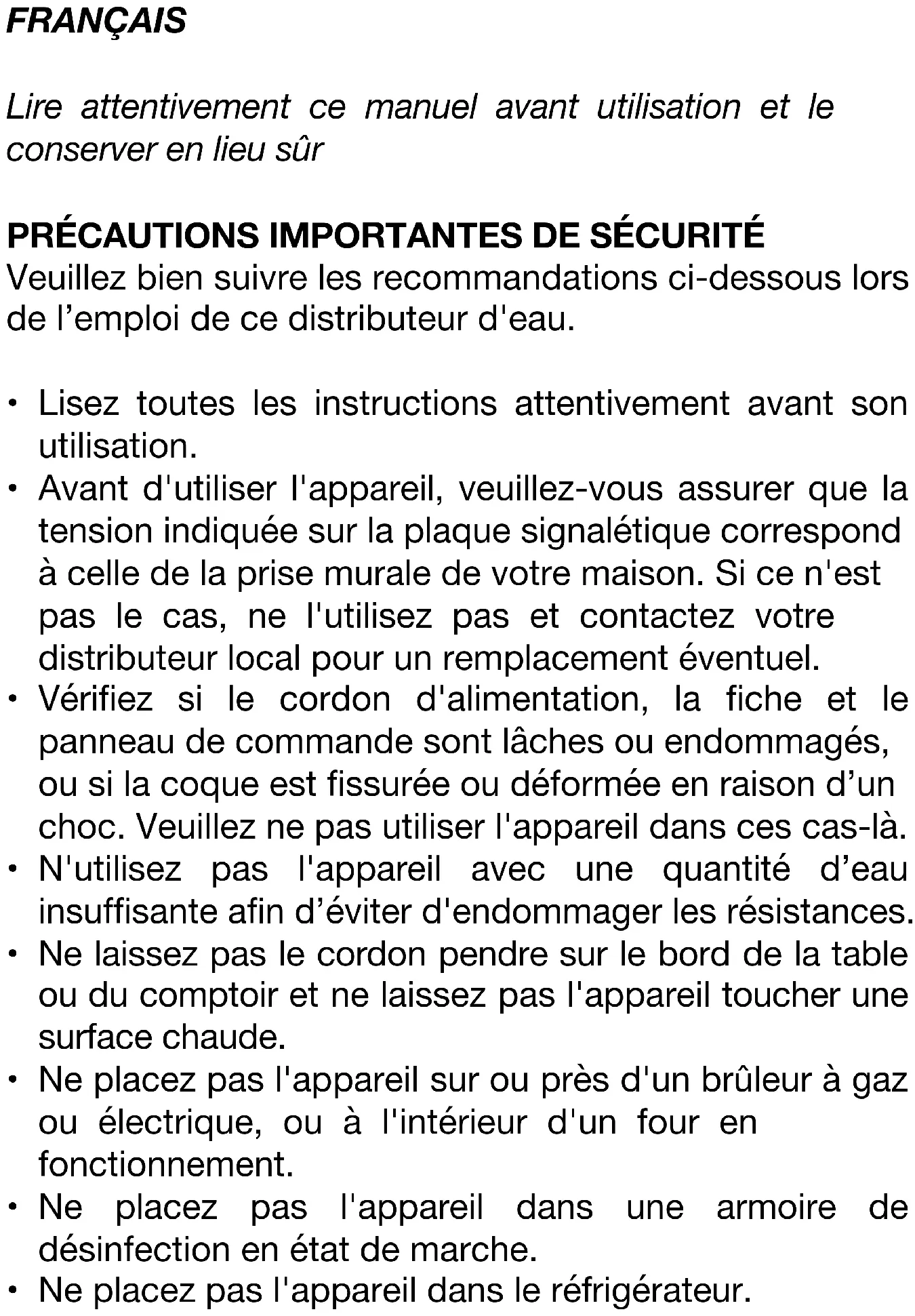 Veuillez bien suivre les recommandations ci-dessous lors de l’emploi de ce distributeur d'eau.
