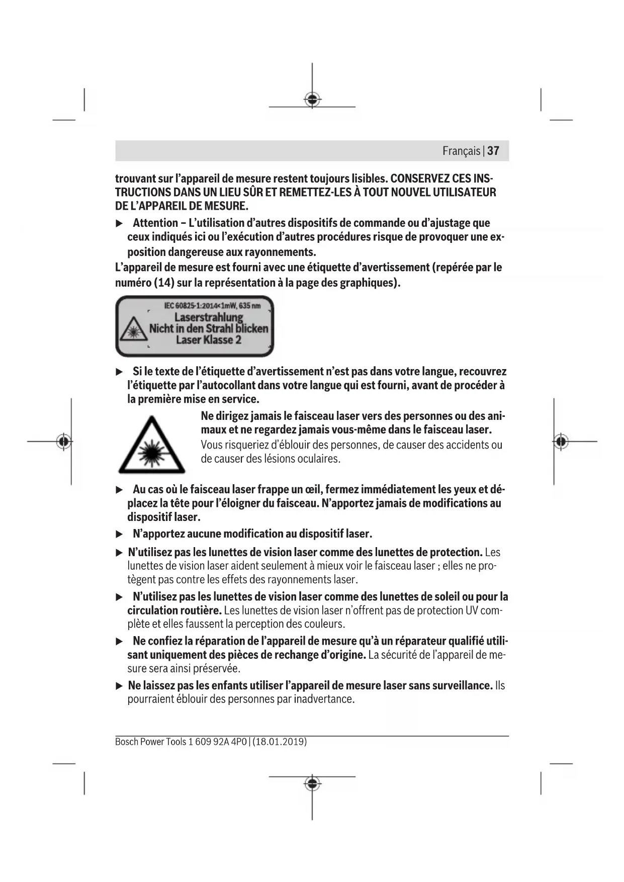 et le logo associé sont des marques déposées de la Bluetooth SIG, Inc. Toute utilisation de cette marque/de ce logo par la société Ro- bert Bosch Power Tools GmbH s’effectue sous licence. Description des prestations et du produit Utilisation conforme L’appareil de mesure est destiné à la mesure de distances, de longueurs, de hauteurs et d’écartements, ainsi qu’au calcul de surfaces et de volumes. L’appareil de mesure est approprié pour une utilisation en intérieur. Les résultats de mesure peuvent aussi être transmis à d’autres appareils via Bluetooth®. Éléments constitutifs La numérotation des éléments de l’appareil se réfère à la représentation de l’appareil de mesure sur la page graphique. (1) Touche Plus [+] (2) Touche de fonction (3) Touche Bluetooth® (4) Touche de mesure [ ] (5) Écran couleur (6) Touche Sélection du plan de référence (7) Touche Moins [–] 1 609 92A 4P0 | (18.01.2019) Bosch Power ToolsFrançais | 39 (8) Touche Marche/Arrêt [ ] (9) Couvercle du compartiment à piles (10) Dispositif de verrouillage du couvercle du compartiment à piles (11) Numéro de série (12) Lentille de réception (13) Sortie faisceau laser (14) Étiquette d’avertissement laser (15) Lunettes de vision laser