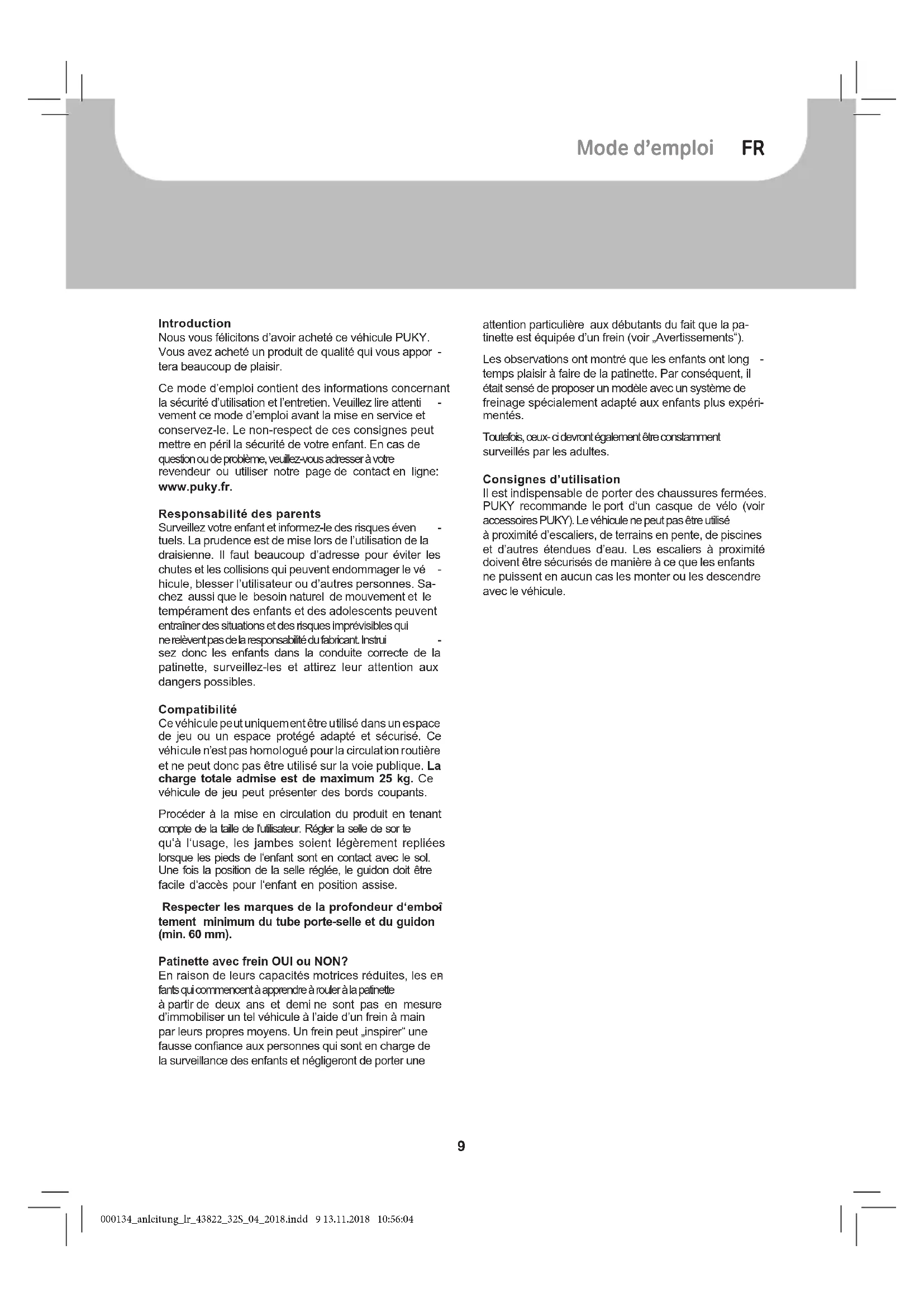 vement ce mode d’emploi avant la mise en service et conservez-le. Le non-respect de ces consignes peut mettre en péril la sécurité de votre enfant. En cas de question ou de problème, veuillez-vous adresser à votre revendeur ou utiliser notre page de contact en ligne: www.puky.fr. Responsabilité des parents Surveillez votre enfant et informez-le des risques éven