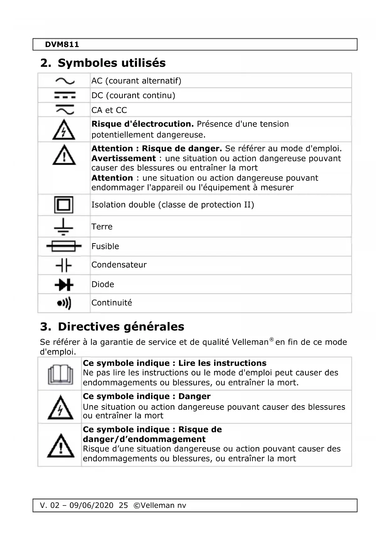 Cet appareil n’est pas étalonné par défaut ! Consignes concernant l’environnement d’utilisation : N’utiliser cet appareil que dans un environnement CAT I, CAT II et CAT III (voir §7). N’utiliser cet appareil que dans un environnement avec degré de pollution 2 (voir §8).DVM811