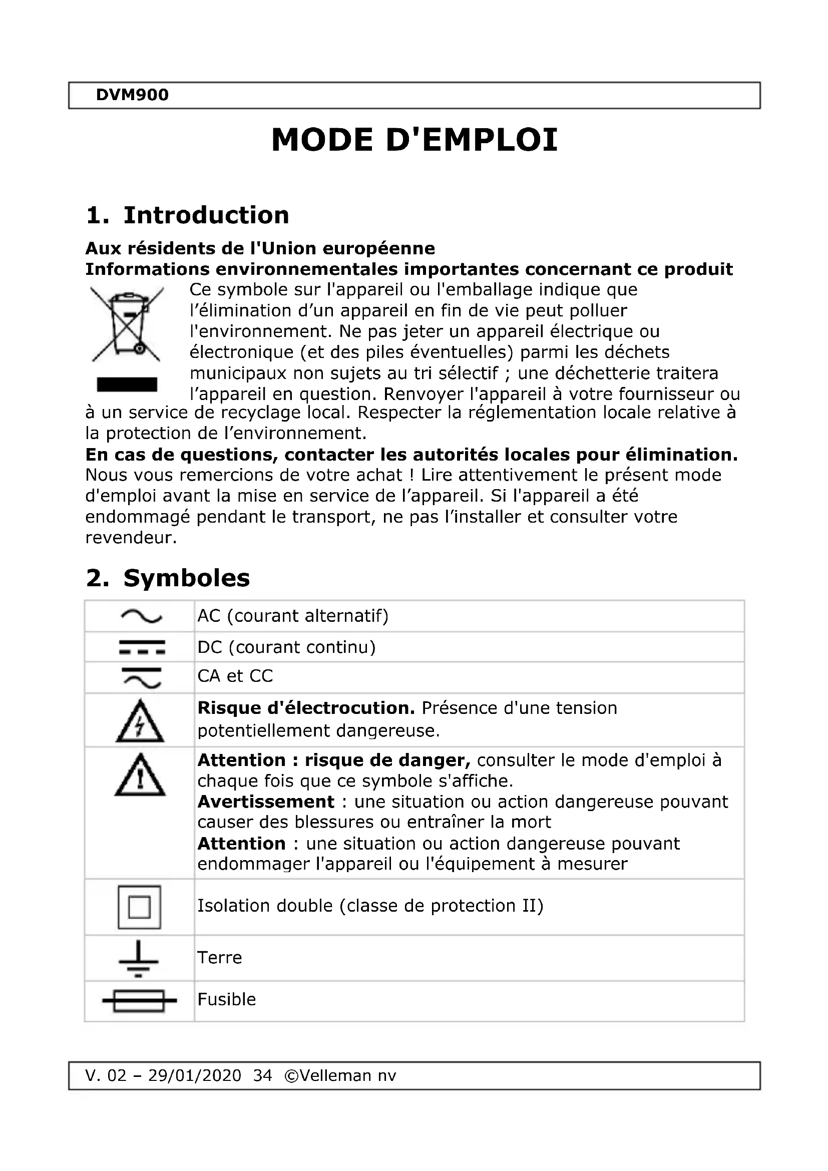 Téléchargez la notice de votre Multimètre au format PDF gratuitement ! Retrouvez votre notice DVM900 - VELLEMAN et reprennez votre appareil électronique en main. Sur cette page sont publiés tous les documents nécessaires à l'utilisation de votre appareil DVM900 de la marque VELLEMAN.