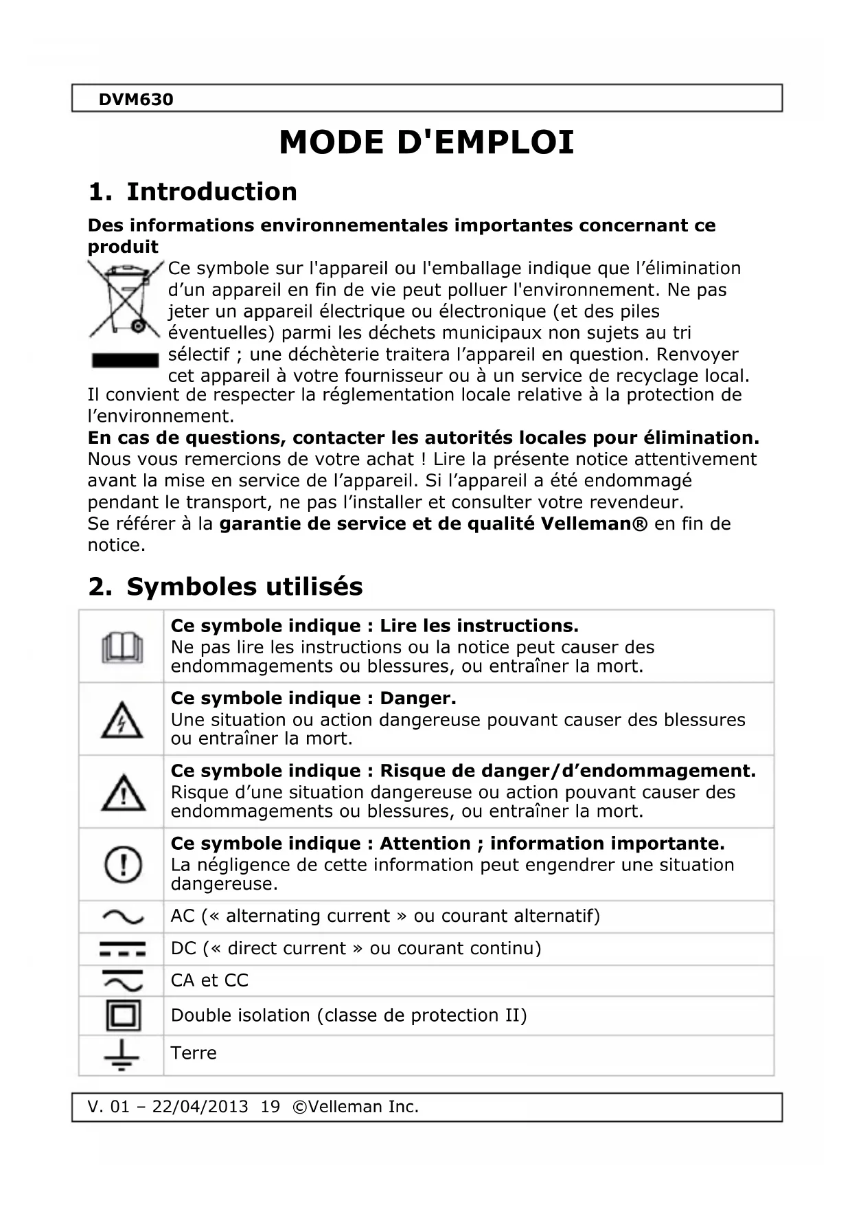 Téléchargez la notice de votre Multimètre au format PDF gratuitement ! Retrouvez votre notice DVM630 - VELLEMAN et reprennez votre appareil électronique en main. Sur cette page sont publiés tous les documents nécessaires à l'utilisation de votre appareil DVM630 de la marque VELLEMAN.
