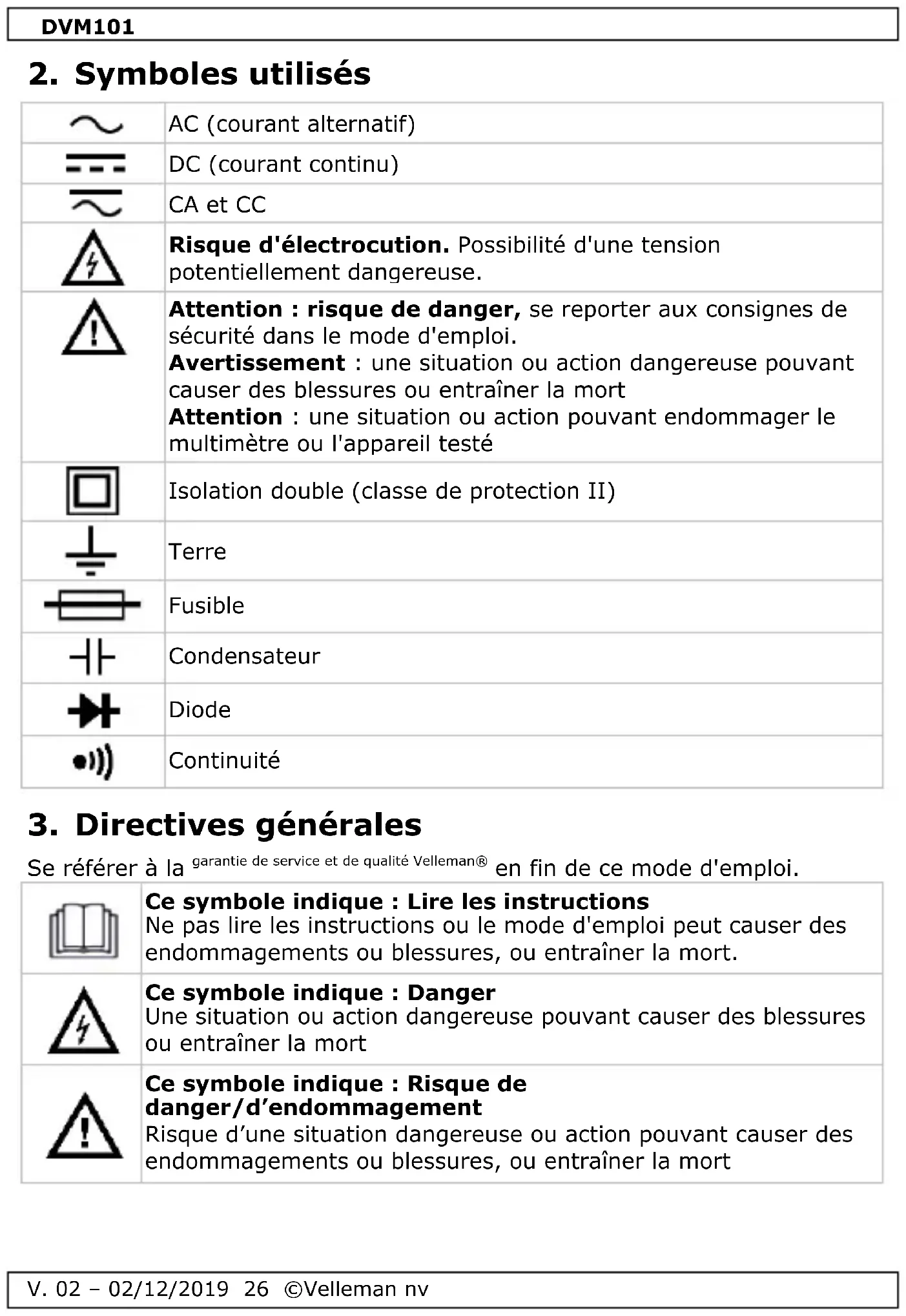 Téléchargez la notice de votre Multimètre au format PDF gratuitement ! Retrouvez votre notice DVM101 - VELLEMAN et reprennez votre appareil électronique en main. Sur cette page sont publiés tous les documents nécessaires à l'utilisation de votre appareil DVM101 de la marque VELLEMAN.