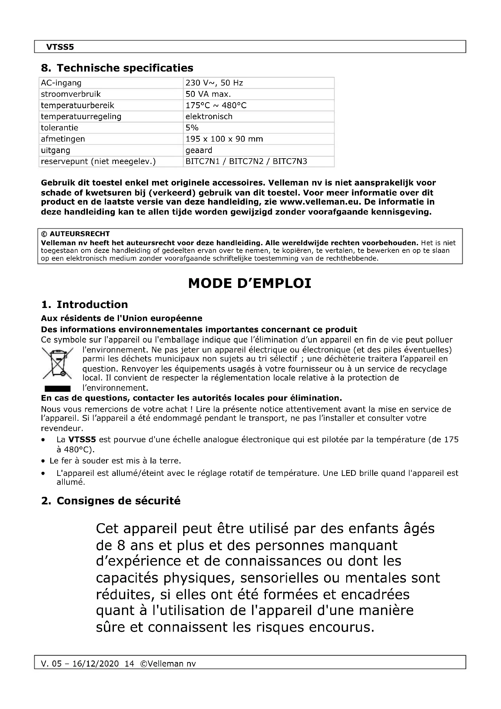 SA Velleman est l’ayant droit des droits d’auteur pour cette notice. Tous droits mondiaux réservés. Toute reproduction, traduction, copie ou diffusion, intégrale ou partielle, du contenu de cette notice par quelque procédé ou sur tout support électronique que se soit est interdite sans l’accord préalable écrit de l’ayant droit.VTSS5