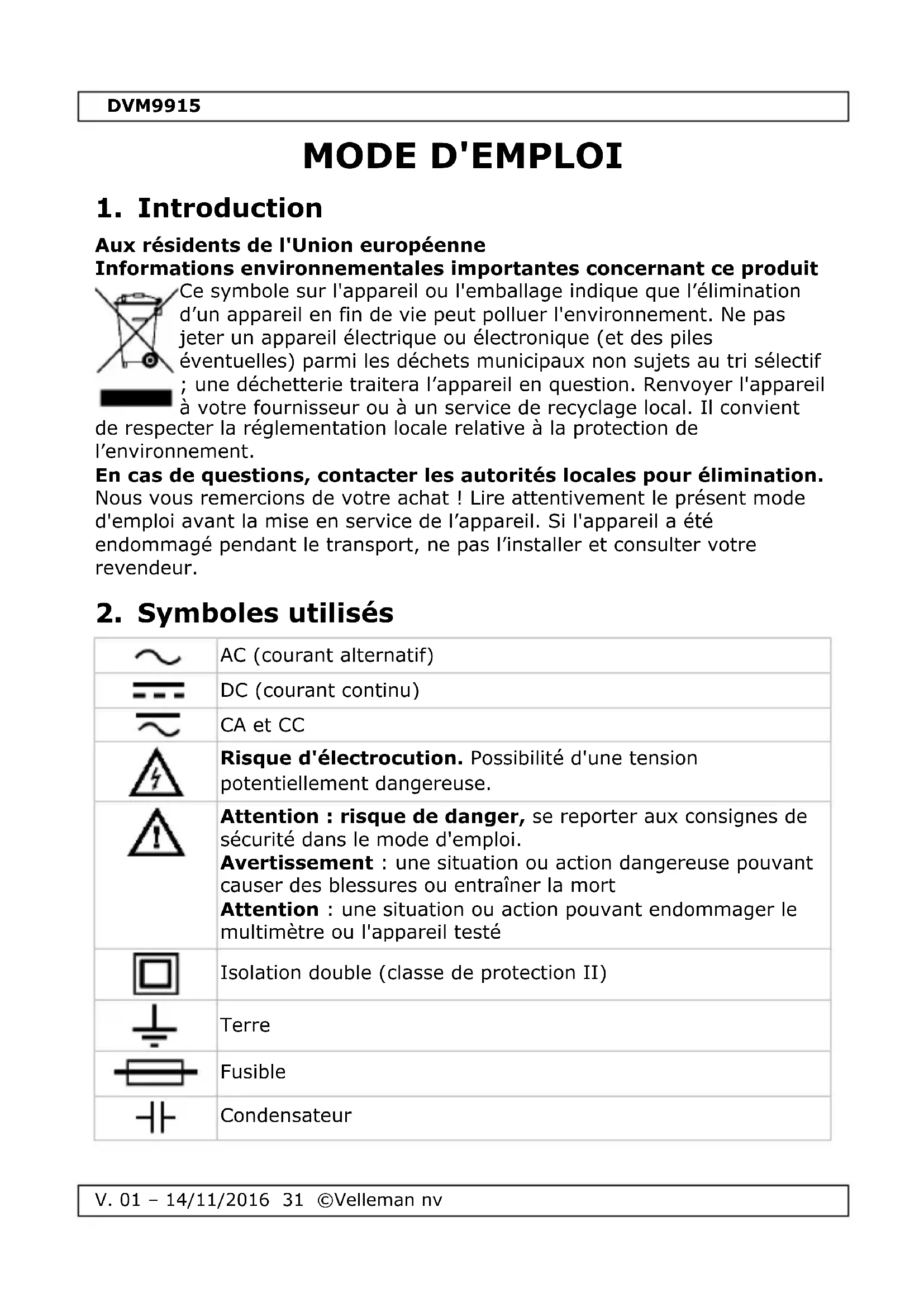 DVM9915 - Multimètre VELLEMAN - Notice d'utilisation et mode d'emploi gratuit