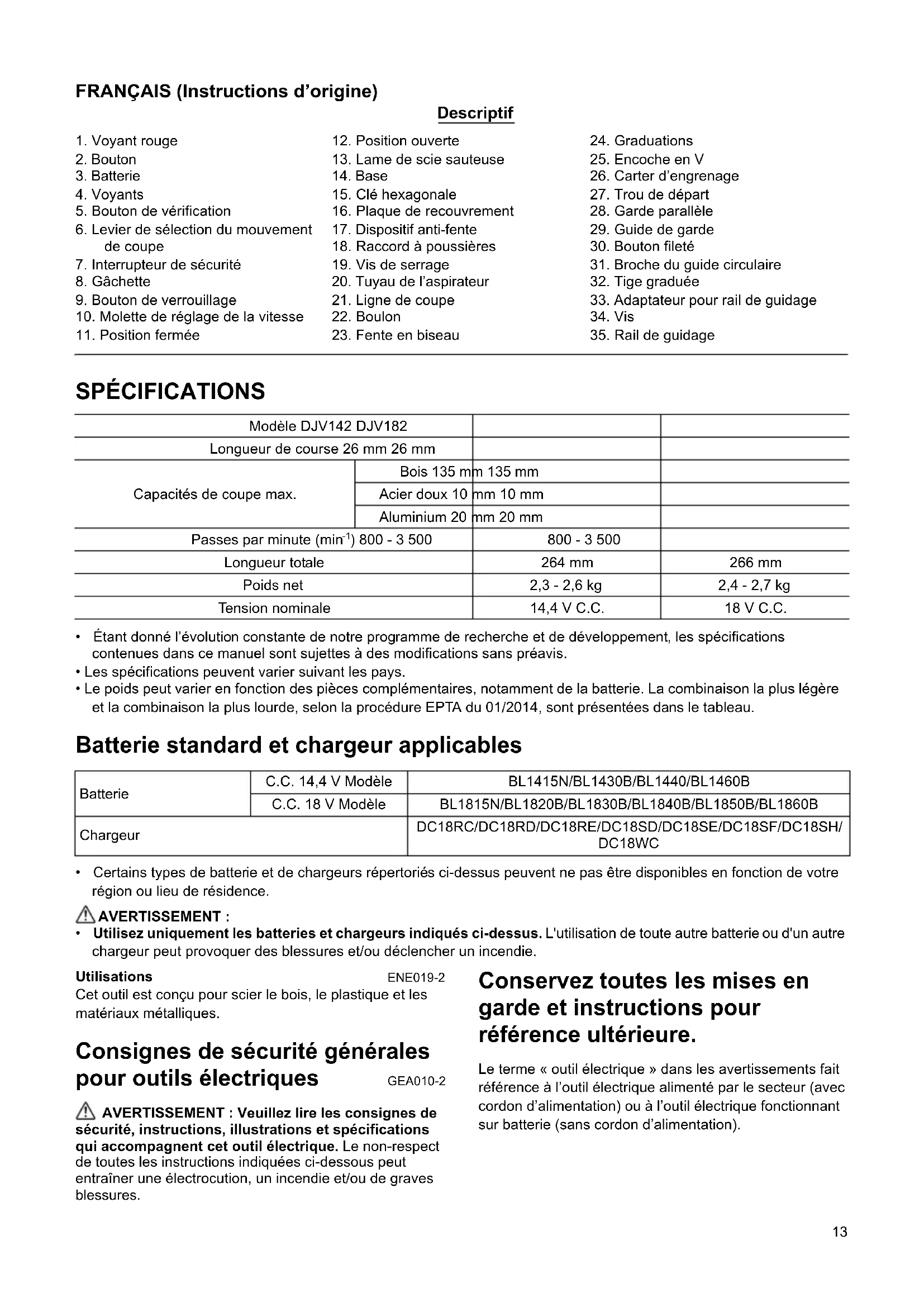 - Utilisez uniquement les batteries et chargeurs indiqués ci-dessus. L'utilisation de toute autre batterie ou d'un autre chargeur peut provoquer des blessures et/ou déclencher un incendie. Utilisations ENE019-2 Cet outil est conçu pour scier le bois, le plastique et les matériaux métalliques. Consignes de sécurité générales pour outils électriques GEA010-2