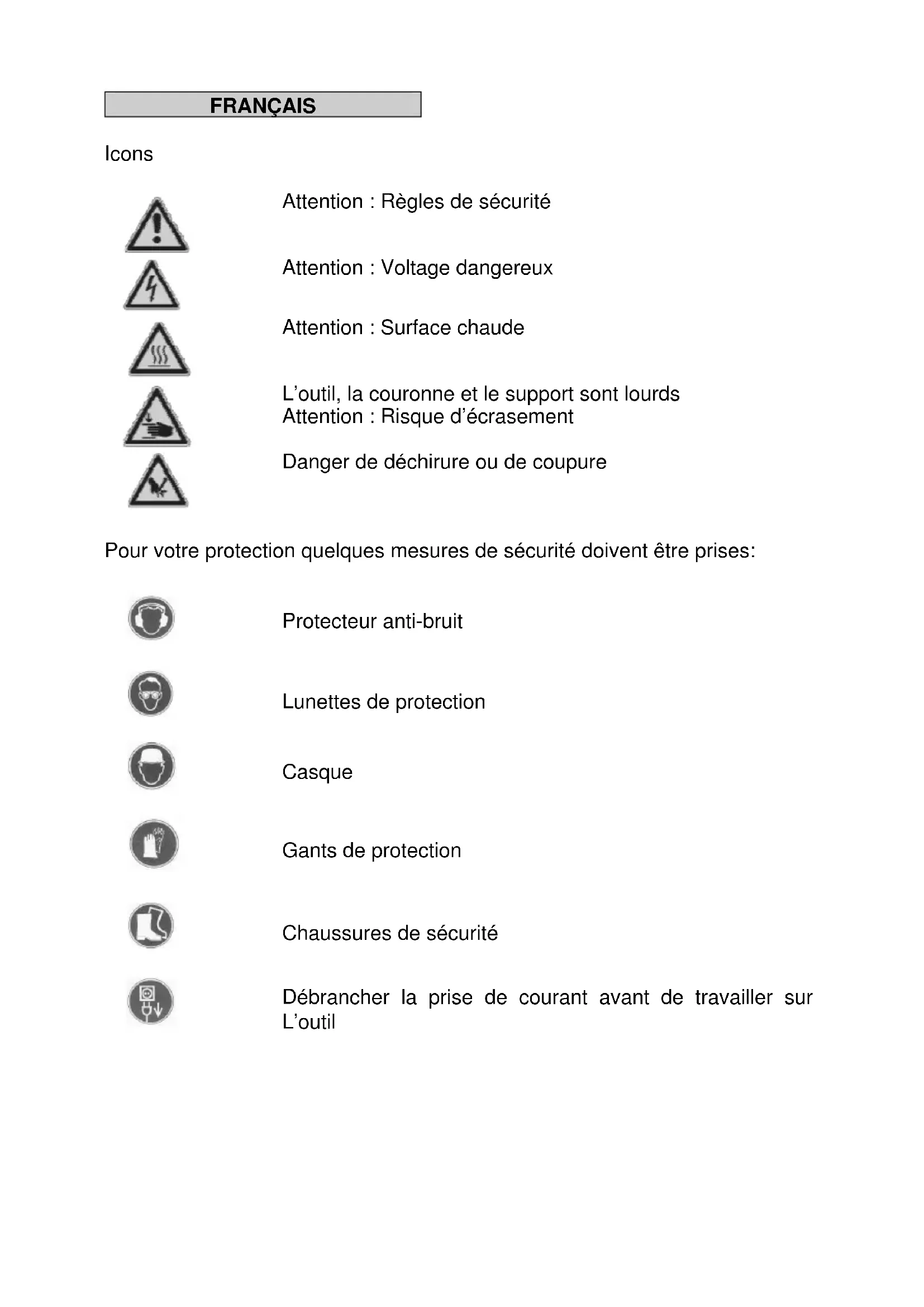 Débrancher la prise de courant avant de travailler sur L’outilCaractéristiques Techniques