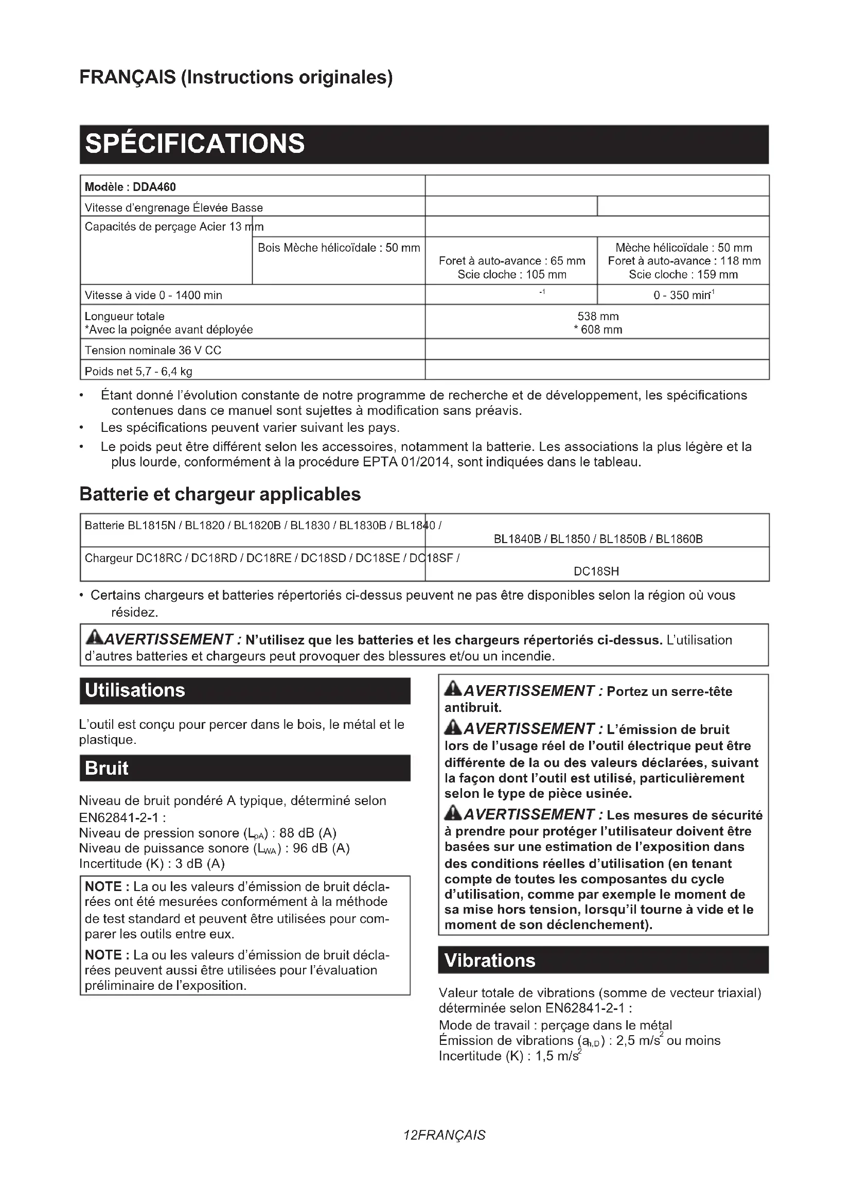 - Makitagenuinebatteryandcharger NOTE:Someitemsinthelistmaybeincludedinthe toolpackageasstandardaccessories.Theymay dierfromcountrytocountry.12 FRANÇAIS FRANÇAIS (Instructions originales) SPÉCIFICATIONS Modèle : DDA460 Vitesse d’engrenage Élevée Basse Capacités de perçage Acier 13 mm Bois Mèche hélicoïdale : 50 mm Foret à auto-avance : 65 mm Scie cloche : 105 mm Mèche hélicoïdale : 50 mm Foret à auto-avance : 118 mm Scie cloche : 159 mm Vitesse à vide 0 - 1400 min