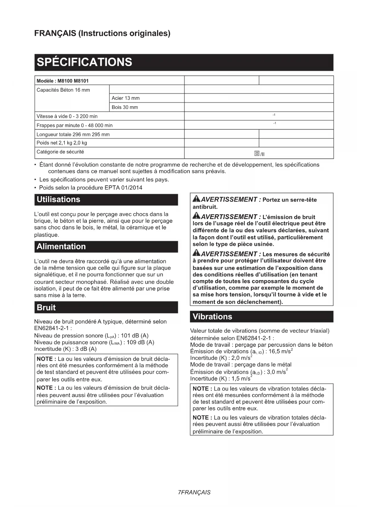 - Poids selon la procédure EPTA 01/2014 Utilisations L’outil est conçu pour le perçage avec chocs dans la brique, le béton et la pierre, ainsi que pour le perçage sans choc dans le bois, le métal, la céramique et le plastique. Alimentation L’outil ne devra être raccordé qu’à une alimentation de la même tension que celle qui gure sur la plaque signalétique, et il ne pourra fonctionner que sur un courant secteur monophasé. Réalisé avec une double isolation, il peut de ce fait être alimenté par une prise sans mise à la terre. Bruit Niveau de bruit pondéré A typique, déterminé selon EN62841-2-1 : Niveau de pression sonore (L