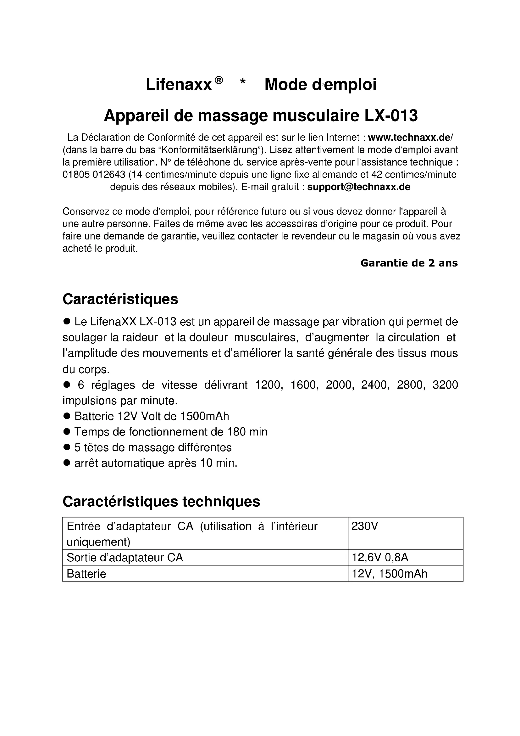- Mode d’emploi Appareil de massage musculaire LX-013 La Déclaration de Conformité de cet appareil est sur le lien Internet : www.technaxx.de/ (dans la barre du bas “Konformitätserklärung”). Lisez attentivement le mode d’emploi avant la première utilisation. N° de téléphone du service après-vente pour l’assistance technique : 01805 012643 (14 centimes/minute depuis une ligne fixe allemande et 42 centimes/minute depuis des réseaux mobiles). E-mail gratuit : support@technaxx.de Conservez ce mode d'emploi, pour référence future ou si vous devez donner l'appareil à une autre personne. Faites de même avec les accessoires d’origine pour ce produit. Pour faire une demande de garantie, veuillez contacter le revendeur ou le magasin où vous avez acheté le produit. Garantie de 2 ans Caractéristiques ⚫ Le LifenaXX LX-013 est un appareil de massage par vibration qui permet de soulager la raideur et la douleur musculaires, d’augmenter la circulation et l’amplitude des mouvements et d’améliorer la santé générale des tissus mous du corps. ⚫ 6 réglages de vitesse délivrant 1200, 1600, 2000, 2400, 2800, 3200 impulsions par minute. ⚫ Batterie 12V Volt de 1500mAh ⚫ Temps de fonctionnement de 180 min ⚫ 5 têtes de massage différentes ⚫ arrêt automatique après 10 min. Caractéristiques techniques Entrée d’adaptateur CA (utilisation à l’intérieur uniquement) 230V Sortie d’adaptateur CA 12,6V 0,8A Batterie 12V, 1500mAh2