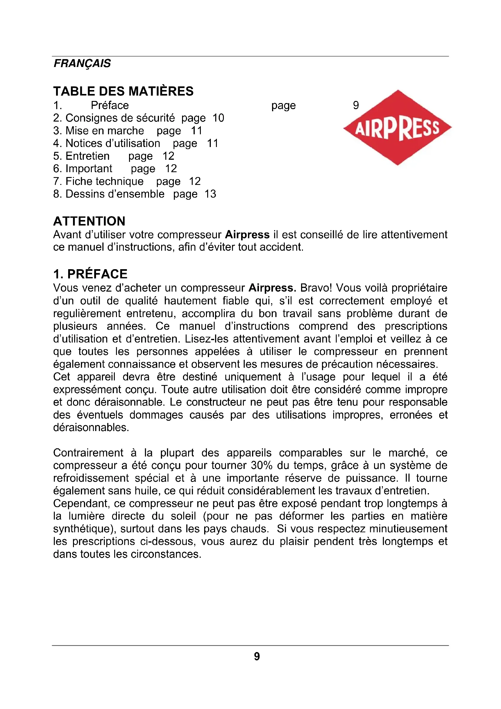 ATTENTION Avant d’utiliser votre compresseur Airpress il est conseillé de lire attentivement ce manuel d’instructions, afin d’éviter tout accident.