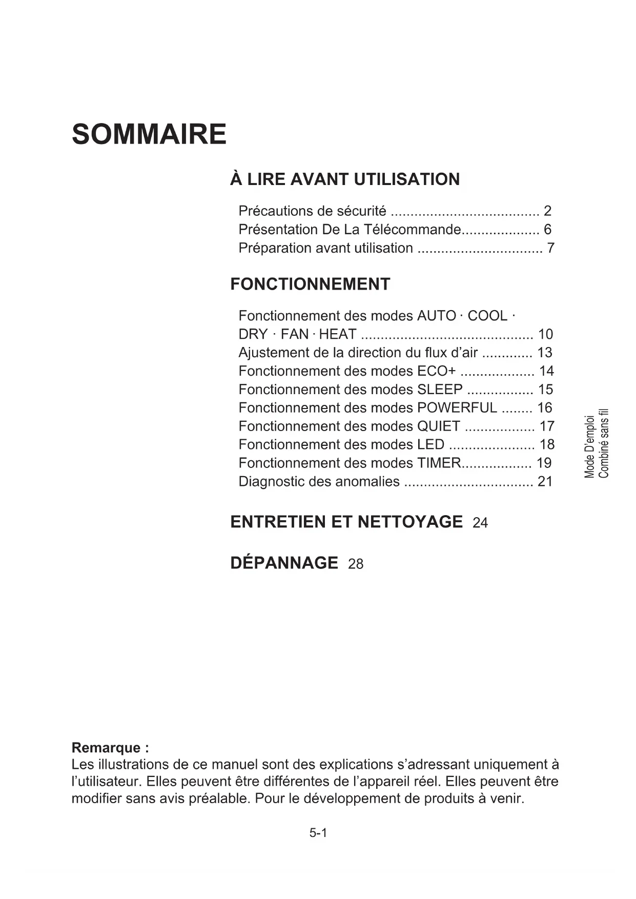 Précautions de sécurité ...................................... 2 Présentation De La Télécommande.................... 6 Préparation avant utilisation ................................ 7 FONCTIONNEMENT Fonctionnement des modes AUTO