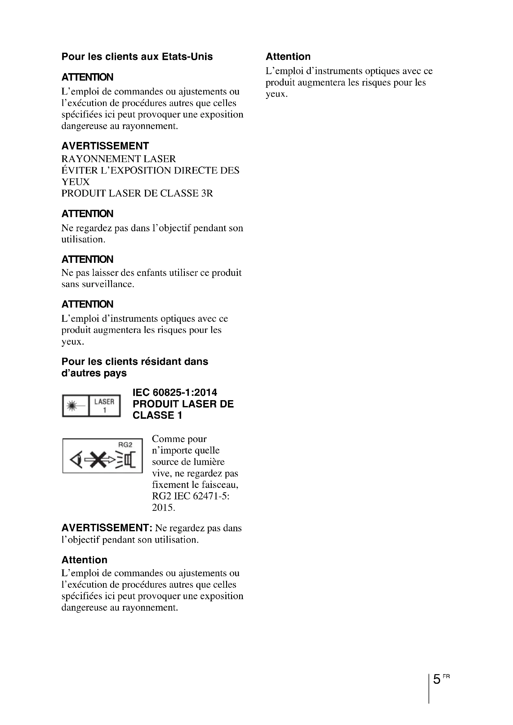 l’objectif pendant son utilisation. Attention L’emploi de commandes ou ajustements ou l’exécution de procédures autres que celles spécifiées ici peut provoquer une exposition dangereuse au rayonnement. Attention L’emploi d’instruments optiques avec ce produit augmentera les risques pour les yeux. IEC 60825-1:2014