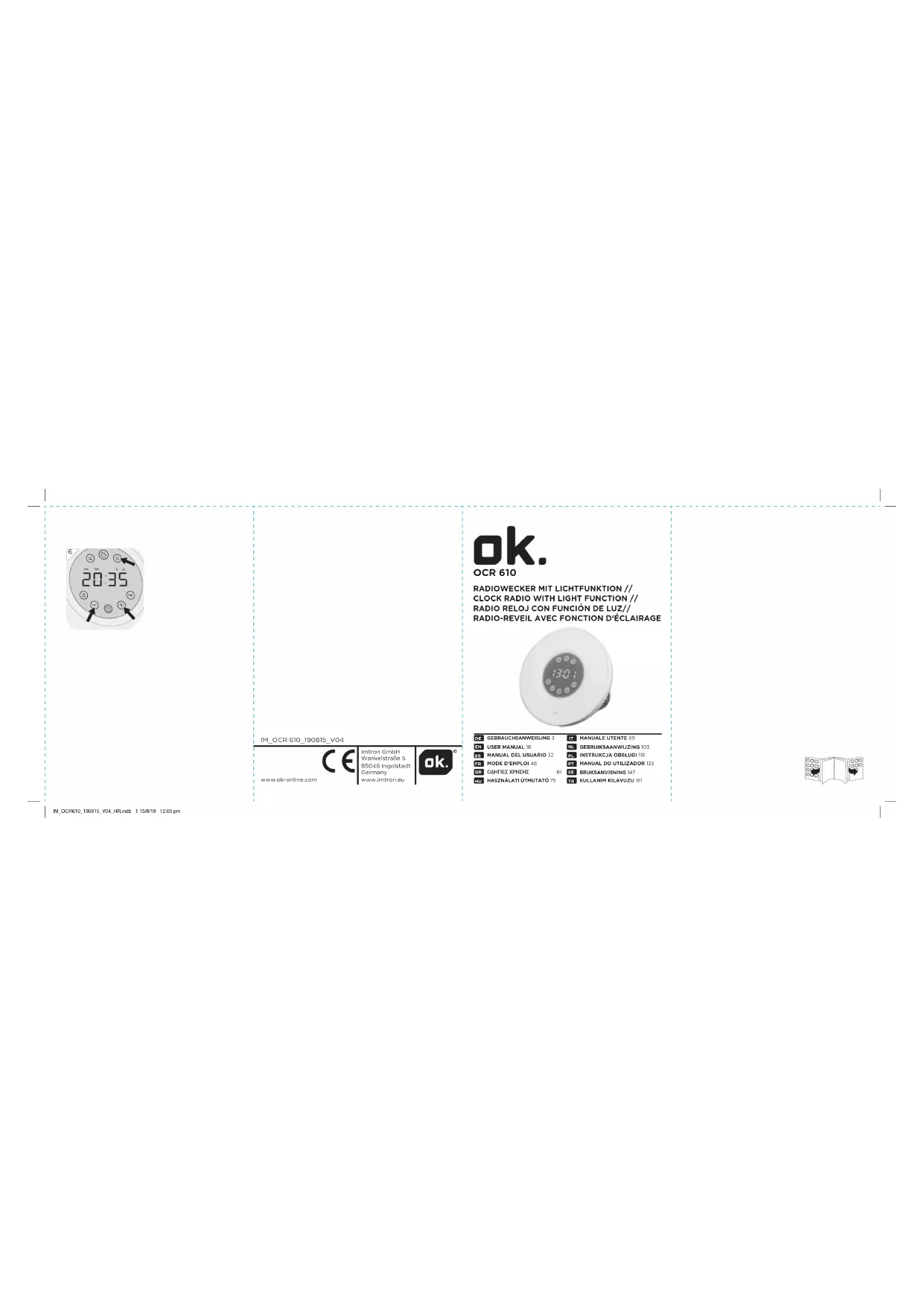 Adaptateur Modèle : AK06WG-0500120VU Fabricant : Shenzhen Guijin Technology Co., Ltd. Entrée nominale : 100-240V~ 50/60Hz, 0,2A Sortie nominale : 5V , 1,2A Classe : II Radio Consommation électrique en fonctionnement : 6 W Consommation électrique en veille : ≤1 W Fonctionnement sur piles de secours : 2 x 1,5 V (Type LR03/AAA) Plage de fréquences : 88-108 MHz Intervalles de réglage : 0,1 MHz Déclaration de conformité Le soussigné, Imtron GmbH, déclare que l’équipement radioélectrique du type OCR 610 est conforme à la directive 2014/53/UE. Le texte complet de la déclaration UE de conformité est disponible à l’adresse internet suivante: http://de.ok-online.com/nc/de/suche.html IM_OCR610_190815_V04_HR.indb 59 15/8/19 12:05 pm60