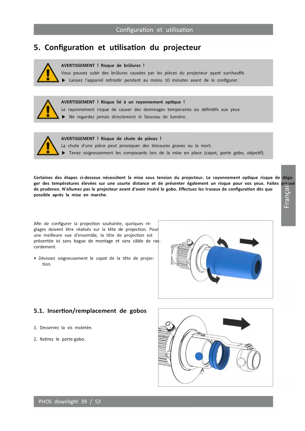 5.1. Insertion/remplacement de gobos 39 5.2. Alignement de la tête de projection 41 5.3. Mise au point du motif 41 5.4. Alignement du motif 42 5.5. Fermeture de la tête de projection 42