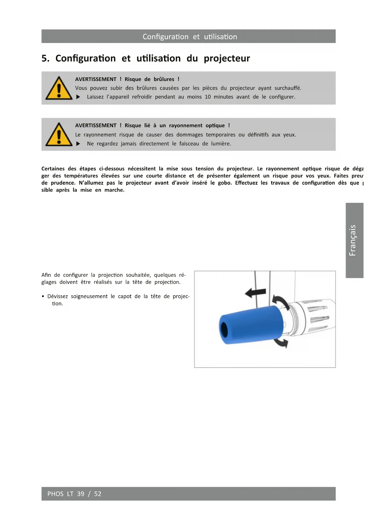 - Dévissez soigneusement le capot de la tête de projec- on. Certaines des étapes ci-dessous nécessitent la mise sous tension du projecteur. Le rayonnement opque risque de déga- ger des températures élevées sur une courte distance et de présenter également un risque pour vos yeux. Faites preuve de prudence. N’allumez pas le projecteur avant d’avoir inséré le gobo. Eectuez les travaux de conguraon dès que pos- sible après la mise en marche. AVERTISSEMENT ! Risque de brûlures ! Vous pouvez subir des brûlures causées par les pièces du projecteur ayant surchaué. ▶ Laissez l’appareil refroidir pendant au moins 10 minutes avant de le congurer. AVERTISSEMENT ! Risque lié à un rayonnement opque ! Le rayonnement risque de causer des dommages temporaires ou dénifs aux yeux. ▶ Ne regardez jamais directement le faisceau de lumière.