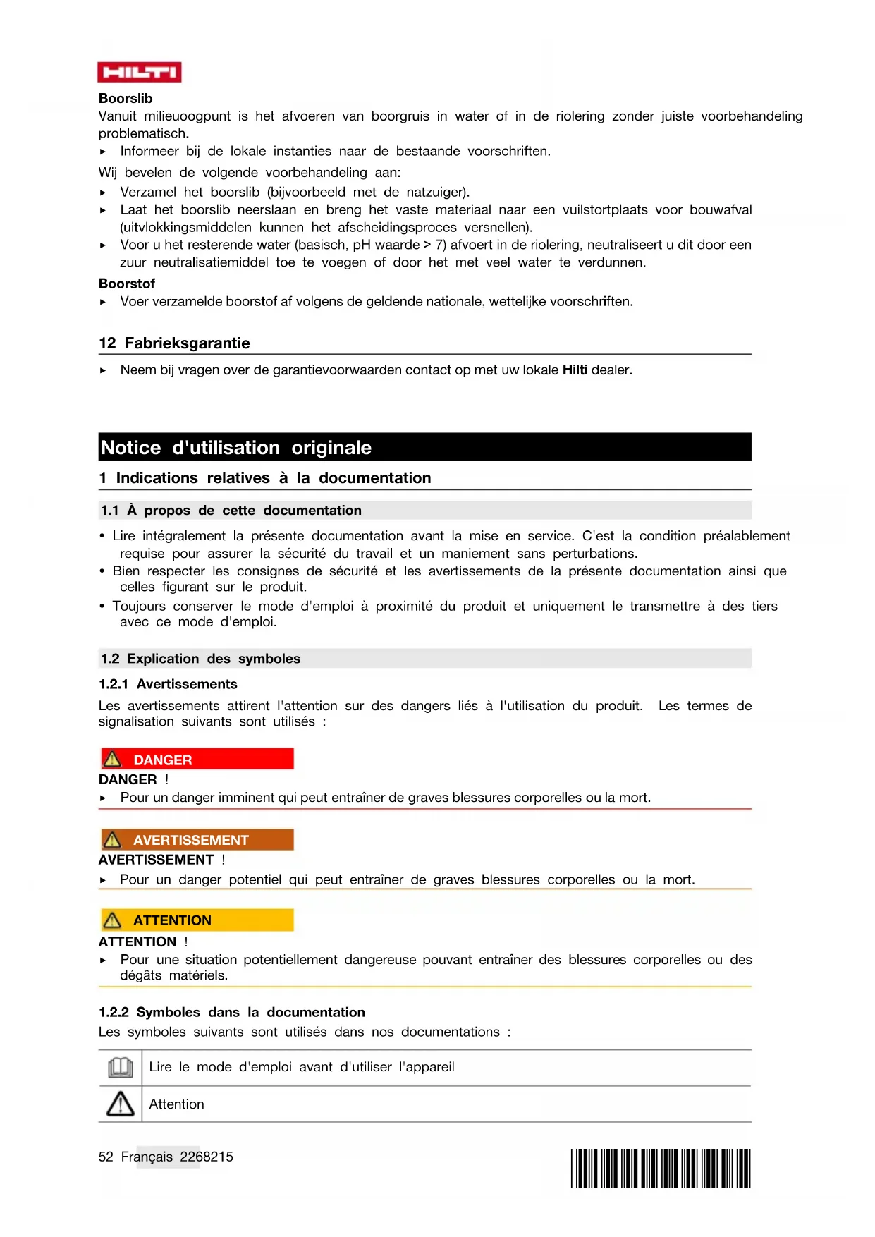 - Page 66 Aucune cartouche filtrante insérée. ▶ Insérer une cartouche filtrante appropriée. → Page 66 L'indicateur de maintenance Coupure eau est allumé. La coupure d'eau a été déclen- chée. ▶ Nettoyer les sondes et l'envi- ronnement des sondes avec une brosse. L'indicateur de maintenance Puissance d'aspiration ré- duite est allumé. Le sac à poussières est plein. ▶ Remplacer le sac à poussières. La cartouche filtrante est très en- crassée. ▶ Si le nettoyage de filtre automa- tique est désactivé, l'activer et laisser l'aspirateur fonctionner pendant 30 secondes. Le flexible d'aspiration ou le collec- teur de poussières de l'outil élec- troportatif est bouché. ▶ Nettoyer le flexible d'aspiration et le collecteur de poussières. Réglage du diamètre du flexible dans une position erronée. ▶ Régler le diamètre du flexible d'aspiration → Page 63.*2268215* 2268215 Español 69 11 Recyclage Les produits Hilti sont fabriqués pour une grande partie en matériaux recyclables. Le recyclage présuppose un tri adéquat des matériaux. Hilti reprend les appareils usagés dans de nombreux pays en vue de leur recyclage. Consulter le service clients Hiltiou un conseiller commercial. Conformément à la directive européenne concernant les appareils électriques et électroniques anciens et sa transposition au niveau national, les appareils électriques usagés doivent être collectés séparément et recyclés de manière non polluante. ▶ Ne pas jeter les appareils électriques dans les ordures ménagères ! Boues de forage En raison de la protection de l'environnement, les boues de forage ne doivent pas être versées dans les cours d'eau ou les canalisations sans prétraitement approprié. ▶ Veuillez vous renseigner auprès de votre administration locale sur les directives en vigueur en la matière. Nous recommandons le prétraitement suivant : ▶ Collecter les boues de forage (par exemple au moyen d'un aspirateur de déchets liquides). ▶ Faire décanter les boues de forage et éliminer la partie sèche sur une décharge industrielle (le procédé peut être accéléré par des agents floculants). ▶ Avant de déverser l'eau résiduelle (basique, pH > 7) dans les canalisations, il convient de la neutraliser en ajoutant un neutralisant acide ou en la diluant avec beaucoup d'eau. Poussière de forage ▶ La poussière de forage accumulée doit être éliminée conformément aux réglementations nationales existantes en vigueur. 12 Garantie constructeur ▶ En cas de questions sur les conditions de garantie, veuillez vous adresser à votre partenaire Hilti local. Manual de instrucciones original 1 Información sobre la documentación