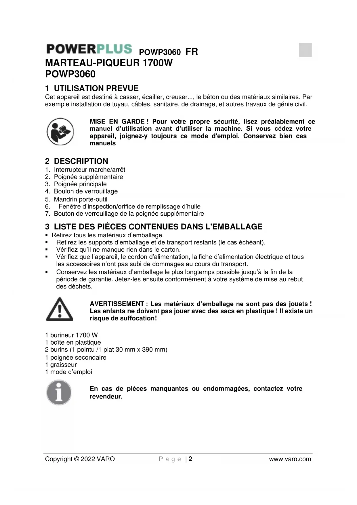 Copyright © 2022 VARO P a g e | 2 www.varo.com MARTEAU-PIQUEUR 1700W POWP3060 1 UTILISATION PREVUE Cet appareil est destiné à casser, écailler, creuser..., le béton ou des matériaux similaires. Par exemple installation de tuyau, câbles, sanitaire, de drainage, et autres travaux de génie civil. MISE EN GARDE ! Pour votre propre sécurité, lisez préalablement ce manuel d’utilisation avant d’utiliser la machine. Si vous cédez votre appareil, joignez-y toujours ce mode d'emploi. Conservez bien ces manuels 2 DESCRIPTION