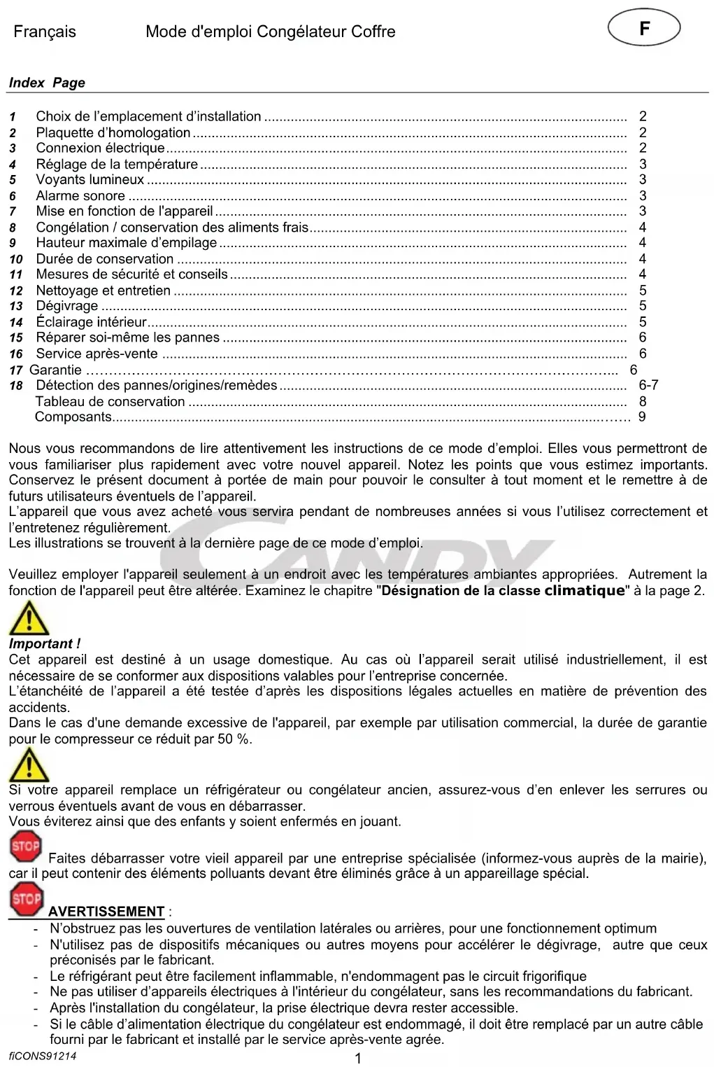 - N’obstruez pas les ouvertures de ventilation latérales ou arrières, pour une fonctionnement optimum - N'utilisez pas de dispositifs mécaniques ou autres moyens pour accélérer le dégivrage, autre que ceux préconisés par le fabricant. - Le réfrigérant peut être facilement inflammable, n'endommagent pas le circuit frigorifique - Ne pas utiliser d’appareils électriques à l'intérieur du congélateur, sans les recommandations du fabricant. - Après l'installation du congélateur, la prise électrique devra rester accessible. - Si le câble d’alimentation électrique du congélateur est endommagé, il doit être remplacé par un autre câble fourni par le fabricant et installé par le service après-vente agrée.Français Mode d'emploi Congélateur Coffre fiCONS91214