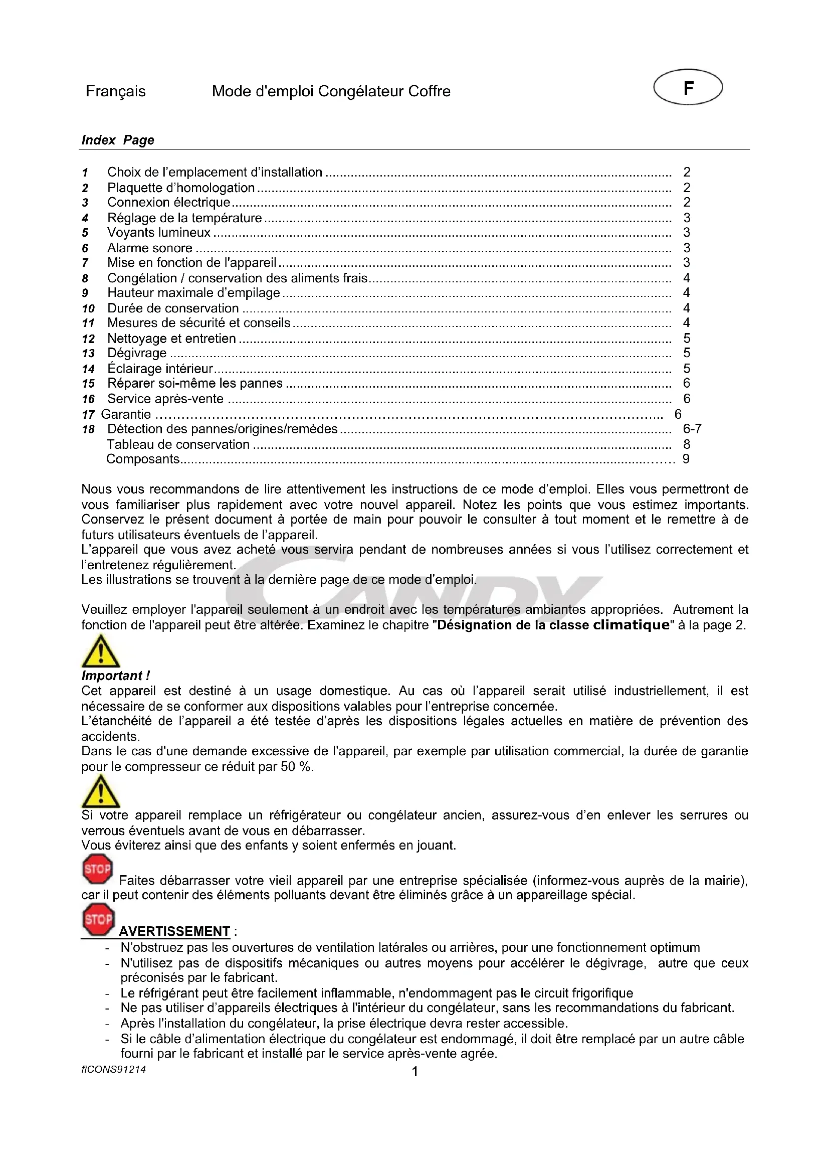 - N’obstruez pas les ouvertures de ventilation latérales ou arrières, pour une fonctionnement optimum - N'utilisez pas de dispositifs mécaniques ou autres moyens pour accélérer le dégivrage, autre que ceux préconisés par le fabricant. - Le réfrigérant peut être facilement inflammable, n'endommagent pas le circuit frigorifique - Ne pas utiliser d’appareils électriques à l'intérieur du congélateur, sans les recommandations du fabricant. - Après l'installation du congélateur, la prise électrique devra rester accessible. - Si le câble d’alimentation électrique du congélateur est endommagé, il doit être remplacé par un autre câble fourni par le fabricant et installé par le service après-vente agrée.Français Mode d'emploi Congélateur Coffre fiCONS91214