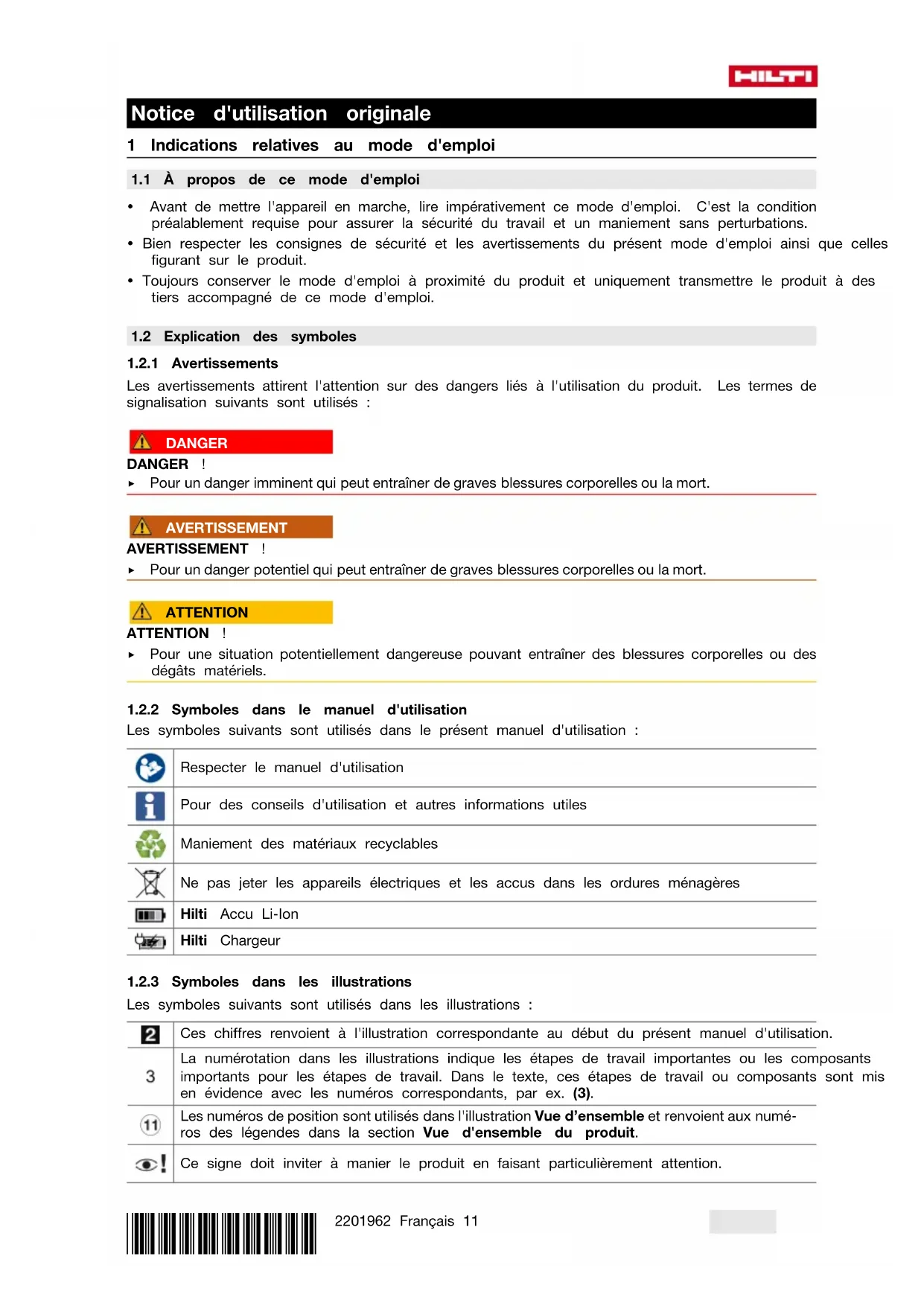 Les symboles suivants sont utilisés dans le présent manuel d'utilisation : Respecter le manuel d'utilisation Pour des conseils d'utilisation et autres informations utiles Maniement des matériaux recyclables Ne pas jeter les appareils électriques et les accus dans les ordures ménagères Hilti Accu Li-Ion Hilti Chargeur