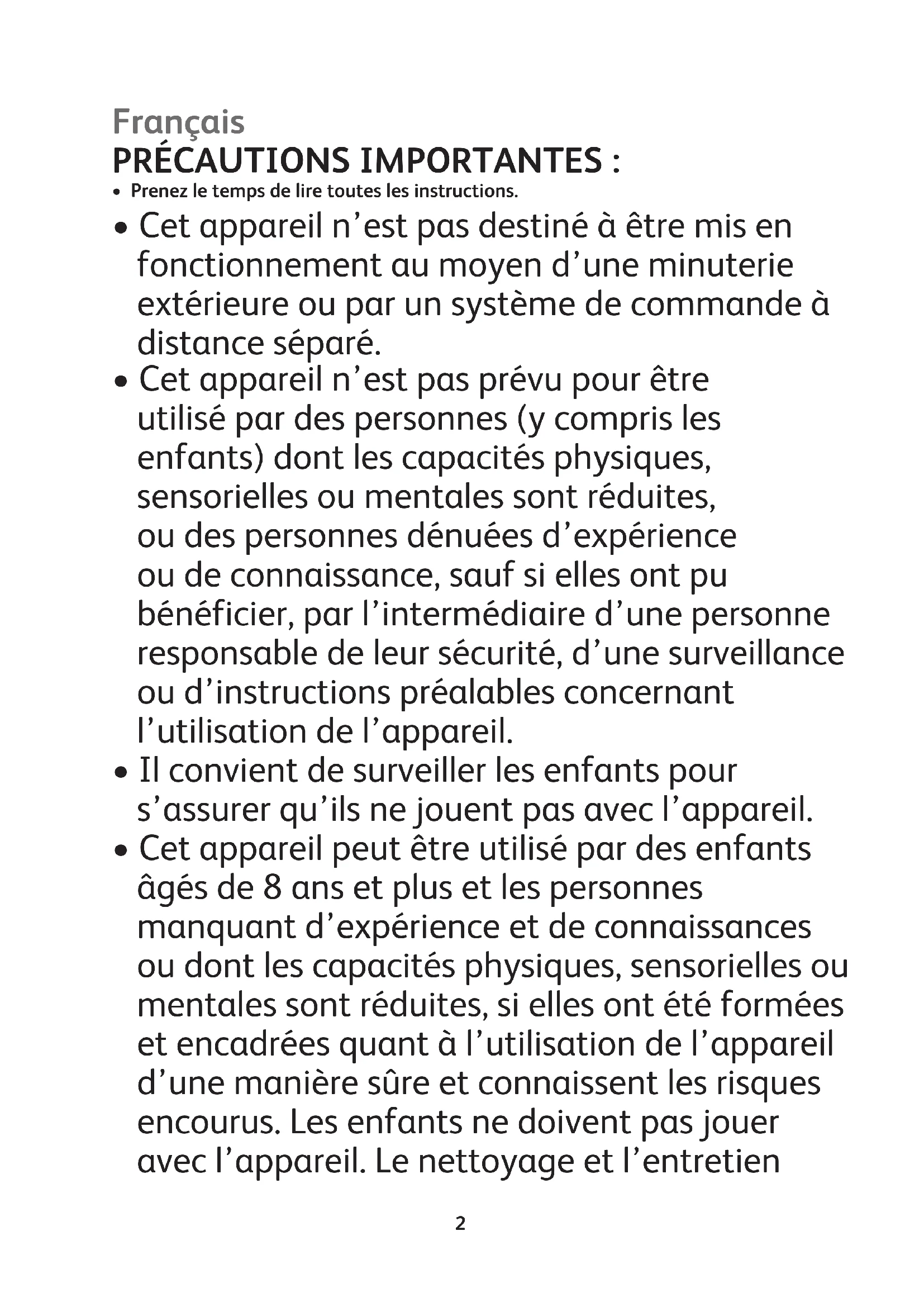- Cet appareil n’est pas destiné à être mis en fonctionnement au moyen d’une minuterie extérieure ou par un système de commande à distance séparé.par l’utilisateur ne doit pas être fait par des enfants à moins qu’ils ne soient âgés de 8 et plus et supervisés.
