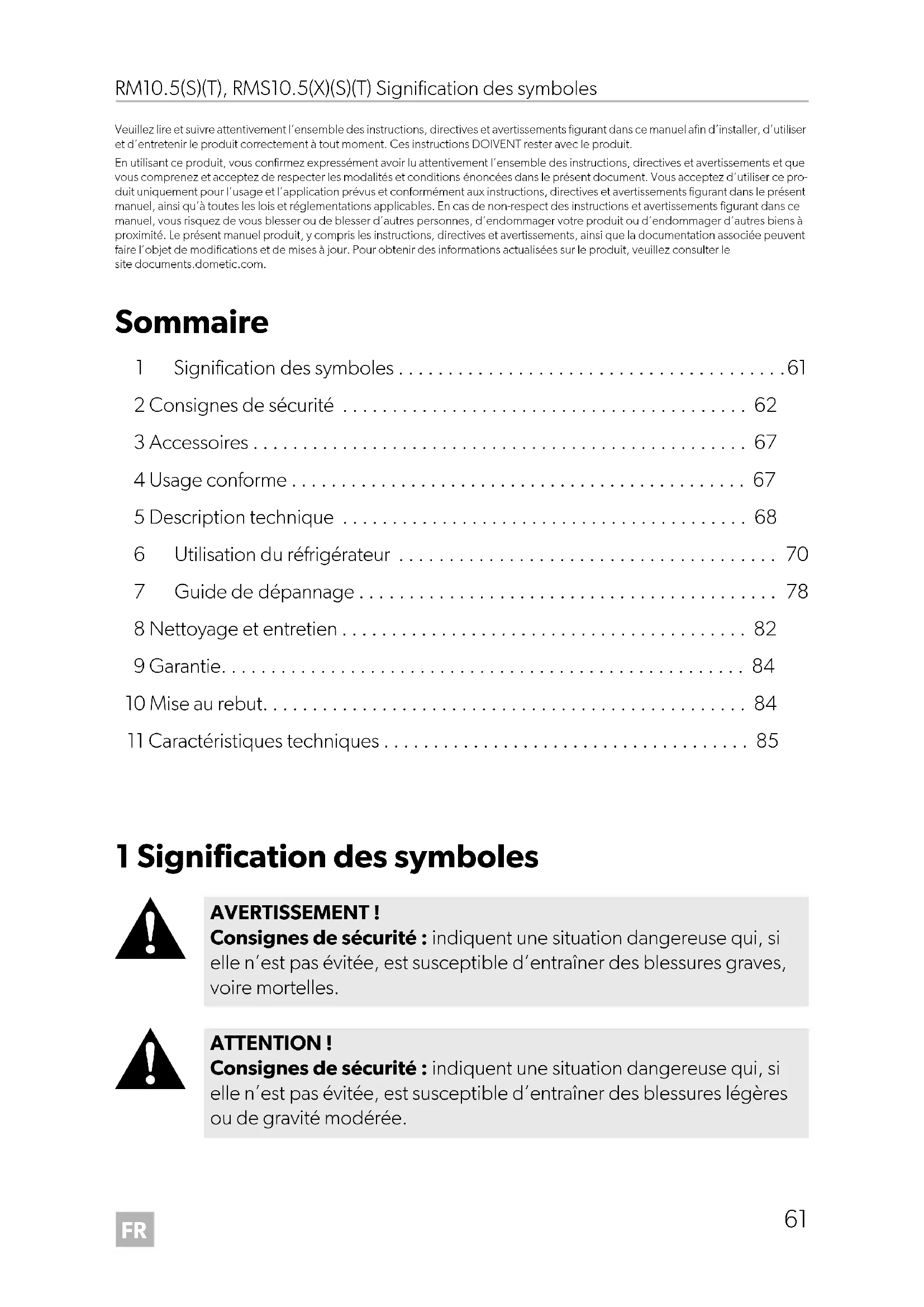 - Veuillez lire et suivre attentivement l’ensemble des instructions, directives et avertissements figurant dans ce manuel afin d’installer, d’utiliser et d’entretenir le produit correctement à tout moment. Ces instructions DOIVENT rester avec le produit. En utilisant ce produit, vous confirmez expressément avoir lu attentivement l’ensemble des instructions, directives et avertissements et que vous comprenez et acceptez de respecter les modalités et conditions énoncées dans le présent document. Vous acceptez d’utiliser ce pro- duit uniquement pour l’usage et l’application prévus et conformément aux instructions, directives et avertissements figurant dans le présent manuel, ainsi qu’à toutes les lois et réglementations applicables. En cas de non-respect des instructions et avertissements figurant dans ce manuel, vous risquez de vous blesser ou de blesser d’autres personnes, d’endommager votre produit ou d’endommager d’autres biens à proximité. Le présent manuel produit, y compris les instructions, directives et avertissements, ainsi que la documentation associée peuvent faire l’objet de modifications et de mises à jour. Pour obtenir des informations actualisées sur le produit, veuillez consulter le site documents.dometic.com. Sommaire 1 Signification des symboles p. 61