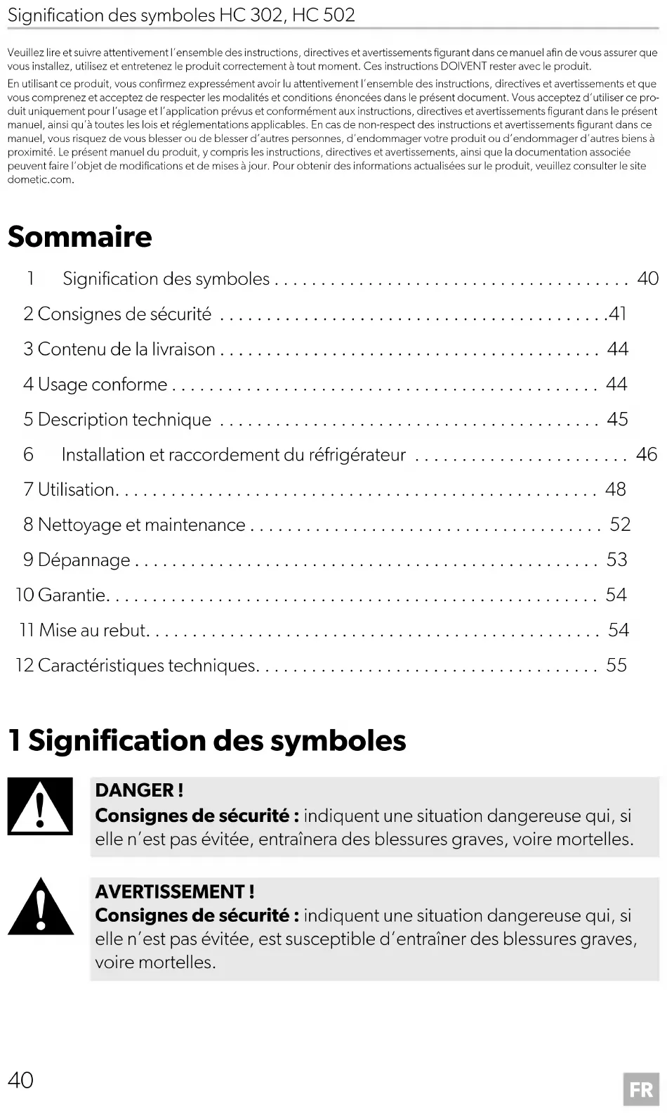 - Veuillez lire et suivre attentivement l’ensemble des instructions, directives et avertissements figurant dans ce manuel afin de vous assurer que vous installez, utilisez et entretenez le produit correctement à tout moment. Ces instructions DOIVENT rester avec le produit. En utilisant ce produit, vous confirmez expressément avoir lu attentivement l’ensemble des instructions, directives et avertissements et que vous comprenez et acceptez de respecter les modalités et conditions énoncées dans le présent document. Vous acceptez d’utiliser ce pro- duit uniquement pour l’usage et l’application prévus et conformément aux instructions, directives et avertissements figurant dans le présent manuel, ainsi qu’à toutes les lois et réglementations applicables. En cas de non-respect des instructions et avertissements figurant dans ce manuel, vous risquez de vous blesser ou de blesser d’autres personnes, d’endommager votre produit ou d’endommager d’autres biens à proximité. Le présent manuel du produit, y compris les instructions, directives et avertissements, ainsi que la documentation associée peuvent faire l’objet de modifications et de mises à jour. Pour obtenir des informations actualisées sur le produit, veuillez consulter le site dometic.com. Sommaire 1 Signification des symboles p. 40