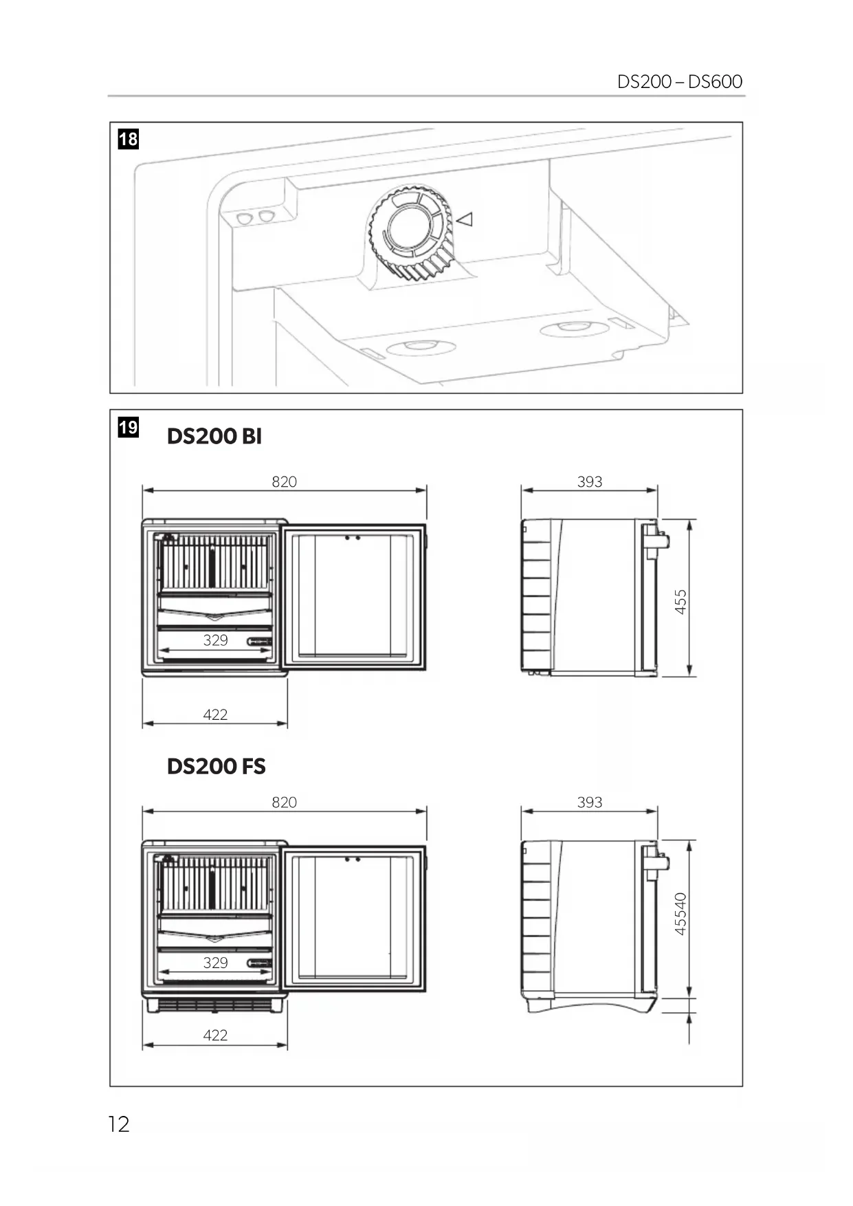 - DS600 : fig. 4, page 6 Pos. Explication 1 Thermostat 2 Lumière intérieure 3 Couvercle pour le groupe frigorifique (uniquement sur les modèles autonomes) 4 Évaporateur 5 Trappe 6 Verrou de porte (option) 7 Capteur d’air 8 Châssis inférieur (uniquement pour les modèles autonomes) 9 Clayette 10 Capteur d’évaporateur 11 Capteur de porte 12 Inserts de porte DometicDS200-300-400-600_IOM_4445103315_EMEA16_2020-xx-xx.book Seite 54 Mittwoch, 3. März 2021 11:36 11FR DS200 – DS600 Installation et raccordement du mini réfrigérateur