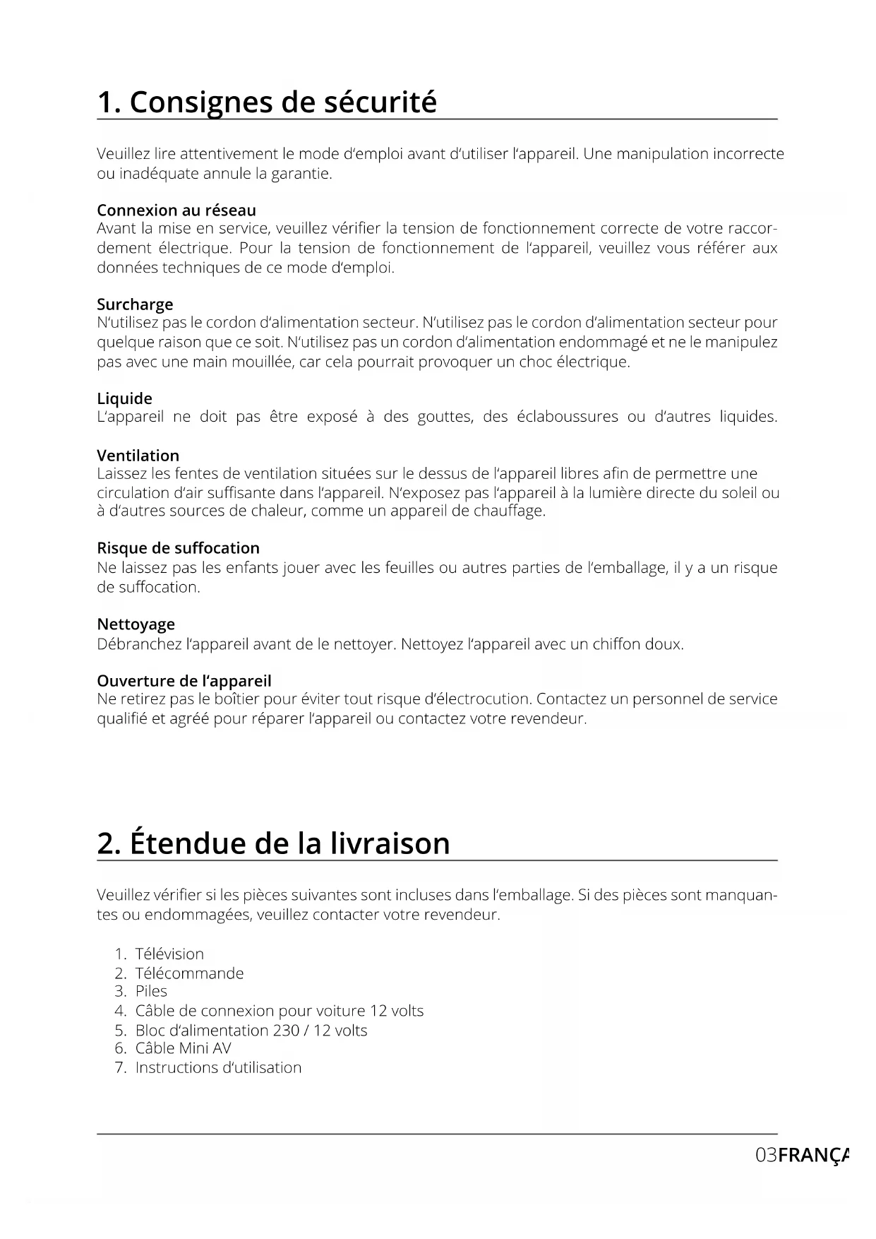Veuillez lire attentivement le mode d‘emploi avant d‘utiliser l‘appareil. Une manipulation incorrecte ou inadéquate annule la garantie. Connexion au réseau Avant la mise en service, veuillez vérier la tension de fonctionnement correcte de votre raccor- dement électrique. Pour la tension de fonctionnement de l‘appareil, veuillez vous référer aux données techniques de ce mode d‘emploi. Surcharge N‘utilisez pas le cordon d‘alimentation secteur. N‘utilisez pas le cordon d‘alimentation secteur pour quelque raison que ce soit. N‘utilisez pas un cordon d‘alimentation endommagé et ne le manipulez pas avec une main mouillée, car cela pourrait provoquer un choc électrique. Liquide L‘appareil ne doit pas être exposé à des gouttes, des éclaboussures ou d‘autres liquides. Ventilation Laissez les fentes de ventilation situées sur le dessus de l‘appareil libres an de permettre une circulation d‘air susante dans l‘appareil. N‘exposez pas l‘appareil à la lumière directe du soleil ou à d‘autres sources de chaleur, comme un appareil de chauage. Risque de suocation Ne laissez pas les enfants jouer avec les feuilles ou autres parties de l‘emballage, il y a un risque de suocation. Nettoyage Débranchez l‘appareil avant de le nettoyer. Nettoyez l‘appareil avec un chion doux. Ouverture de l‘appareil Ne retirez pas le boîtier pour éviter tout risque d‘électrocution. Contactez un personnel de service qualié et agréé pour réparer l‘appareil ou contactez votre revendeur.Branchez le support sur le téléviseur comme indiqué. Utilisez un tournevis approprié et xez les pieds avec les vis fournies. Assurez-vous que les vis sont correctement serrées. Placez le téléviseur sur une surface plane et souple (couverture, mousse, etc.) pour éviter d‘en- dommager le téléviseur ou l‘écran.