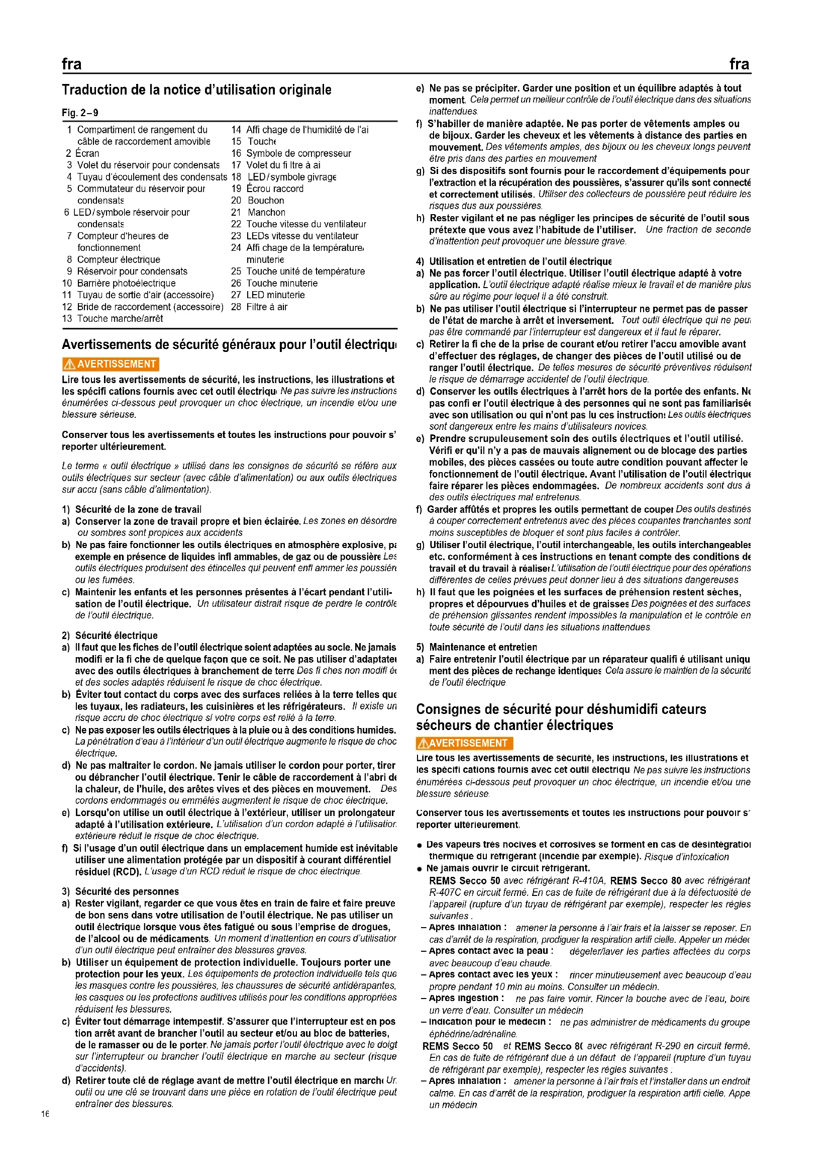 REMS Secco 80 avec réfrigérant R-290 en circuit fermé. En cas de fuite de réfrigérant due à un défaut de l’appareil (rupture d’un tuyau de réfrigérant par exemple), respecter les règles suivantes : – Après inhalation : amener la personne à l’air frais et l’installer dans un endroit calme. En cas d’arrêt de la respiration, prodiguer la respiration artifi cielle. Appeler un médecin. Fig. 2 – 9 1 Compartiment de rangement du câble de raccordement amovible 2 Écran 3 Volet du réservoir pour condensats 4 Tuyau d‘écoulement des condensats 5 Commutateur du réservoir pour condensats 6 LED / symbole réservoir pour condensats 7 Compteur d‘heures de fonctionnement 8 Compteur électrique 9 Réservoir pour condensats 10 Barrière photoélectrique 11 Tuyau de sortie d‘air (accessoire) 12 Bride de raccordement (accessoire) 13 Touche marche/arrêt 14 Affi chage de l‘humidité de l‘air 15 Touche 16 Symbole de compresseur 17 Volet du fi ltre à air 18 LED / symbole givrage 19 Écrou raccord 20 Bouchon 21 Manchon 22 Touche vitesse du ventilateur 23 LEDs vitesse du ventilateur 24 Affi chage de la température/ minuterie 25 Touche unité de température 26 Touche minuterie 27 LED minuterie 28 Filtre à air 16– Après contact avec la peau : rincer les parties affectées du corps à l’eau tiède pendant au moins 15 minutes. Ne pas enlever les vêtements gelés. Appeler un médecin. – Après contact avec les yeux : rincer immédiatement et abondamment l’œil à l’eau en protégeant l’autre œil. Enlever si possible d’éventuels verres de contact. Appeler immédiatement un médecin. – Information du médecin / symptômes possibles : respiration diffi cile, état de narcose, traiter de manière symptomatique, surveiller la circulation.