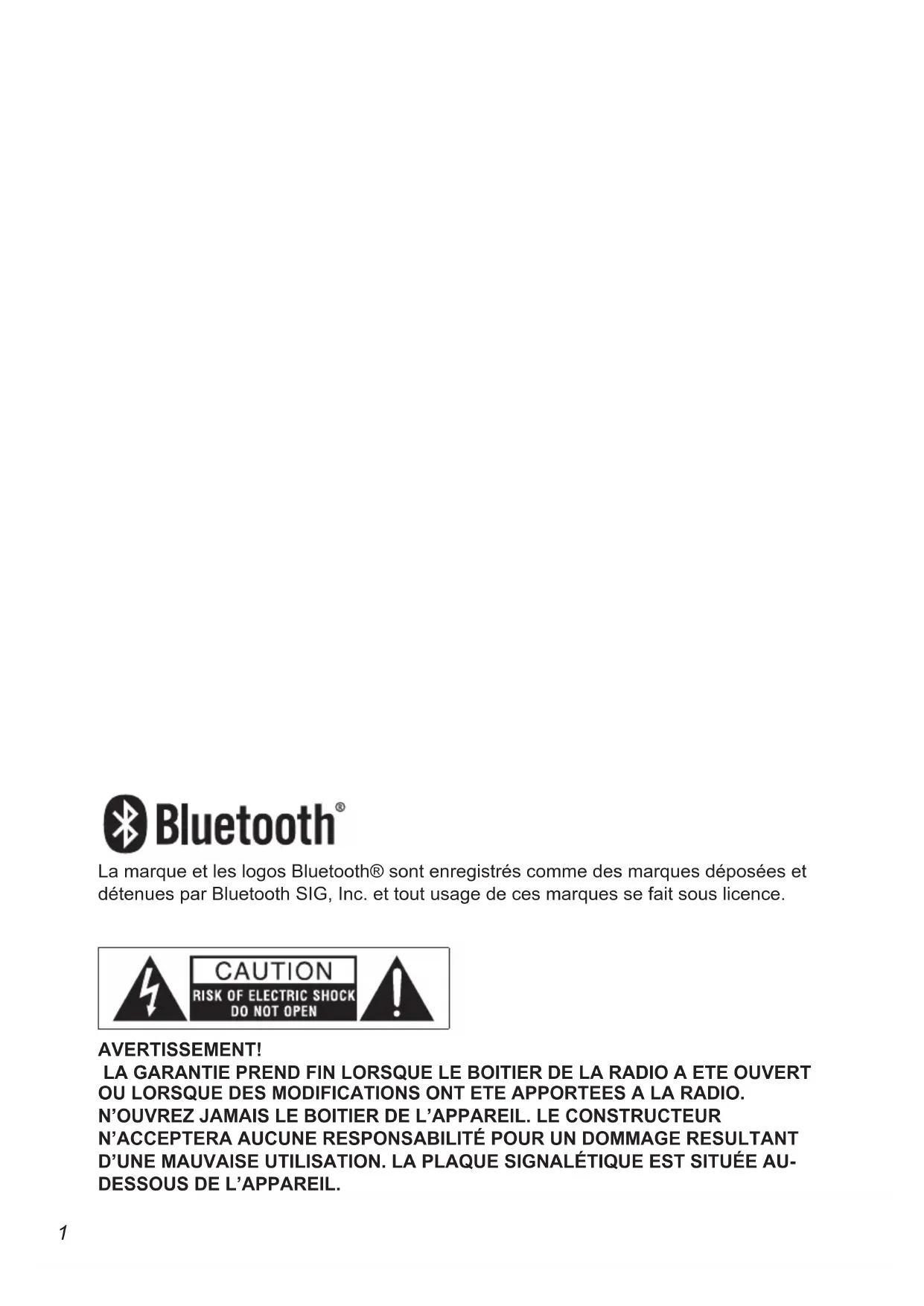 La marque et les logos Bluetooth® sont enregistrés comme des marques déposées et détenues par Bluetooth SIG, Inc. et tout usage de ces marques se fait sous licence. AVERTISSEMENT! LA GARANTIE PREND FIN LORSQUE LE BOITIER DE LA RADIO A ETE OUVERT OU LORSQUE DES MODIFICATIONS ONT ETE APPORTEES A LA RADIO. N’OUVREZ JAMAIS LE BOITIER DE L’APPAREIL. LE CONSTRUCTEUR N’ACCEPTERA AUCUNE RESPONSABILITÉ POUR UN DOMMAGE RESULTANT D’UNE MAUVAISE UTILISATION. LA PLAQUE SIGNALÉTIQUE EST SITUÉE AU-