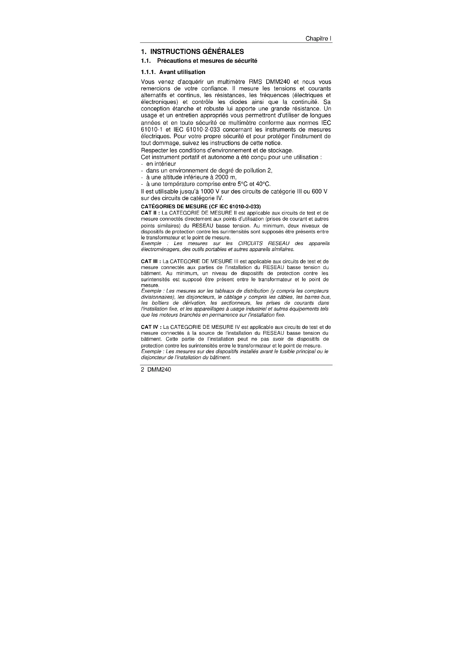 Vous venez d'acquérir un multimètre RMS DMM240 et nous vous remercions de votre confiance. Il mesure les tensions et courants alternatifs et continus, les résistances, les fréquences (électriques et électroniques) et contrôle les diodes ainsi que la continuité. Sa conception étanche et robuste lui apporte une grande résistance. Un usage et un entretien appropriés vous permettront d'utiliser de longues années et en toute sécurité ce multimètre conforme aux normes IEC 61010-1 et IEC 61010-2-033 concernant les instruments de mesures électriques. Pour votre propre sécurité et pour protéger l'instrument de tout dommage, suivez les instructions de cette notice. Respecter les conditions d’environnement et de stockage. Cet instrument portatif et autonome a été conçu pour une utilisation : - en intérieur - dans un environnement de degré de pollution 2, - à une altitude inférieure à 2000 m, - à une température comprise entre 5°C et 40°C. Il est utilisable jusqu’à 1000 V sur des circuits de catégorie III ou 600 V sur des circuits de catégorie IV. CATÉGORIES DE MESURE (CF IEC 61010-2-033) CAT II : La CATEGORIE DE MESURE II est applicable aux circuits de test et de mesure connectés directement aux points d’utilisation (prises de courant et autres points similaires) du RESEAU basse tension. Au minimum, deux niveaux de dispositifs de protection contre les surintensités sont supposés être présents entre le transformateur et le point de mesure. Exemple : Les mesures sur les CIRCUITS RESEAU des appareils électroménagers, des outils portables et autres appareils similaires. CAT III : La CATEGORIE DE MESURE III est applicable aux circuits de test et de mesure connectés aux parties de l'installation du RESEAU basse tension du bâtiment. Au minimum, un niveau de dispositifs de protection contre les surintensités est supposé être présent entre le transformateur et le point de mesure. Exemple : Les mesures sur les tableaux de distribution (y compris les compteurs divisionnaires), les disjoncteurs, le câblage y compris les câbles, les barres-bus, les boîtiers de dérivation, les sectionneurs, les prises de courants dans l'installation fixe, et les appareillages à usage industriel et autres équipements tels que les moteurs branchés en permanence sur l'installation fixe. CAT IV : La CATEGORIE DE MESURE IV est applicable aux circuits de test et de mesure connectés à la source de l'installation du RESEAU basse tension du bâtiment. Cette partie de l’installation peut ne pas avoir de dispositifs de protection contre les surintensités entre le transformateur et le point de mesure. Exemple : Les mesures sur des dispositifs installés avant le fusible principal ou le disjoncteur de l'installation du bâtiment.Chapitre I DMM240 3