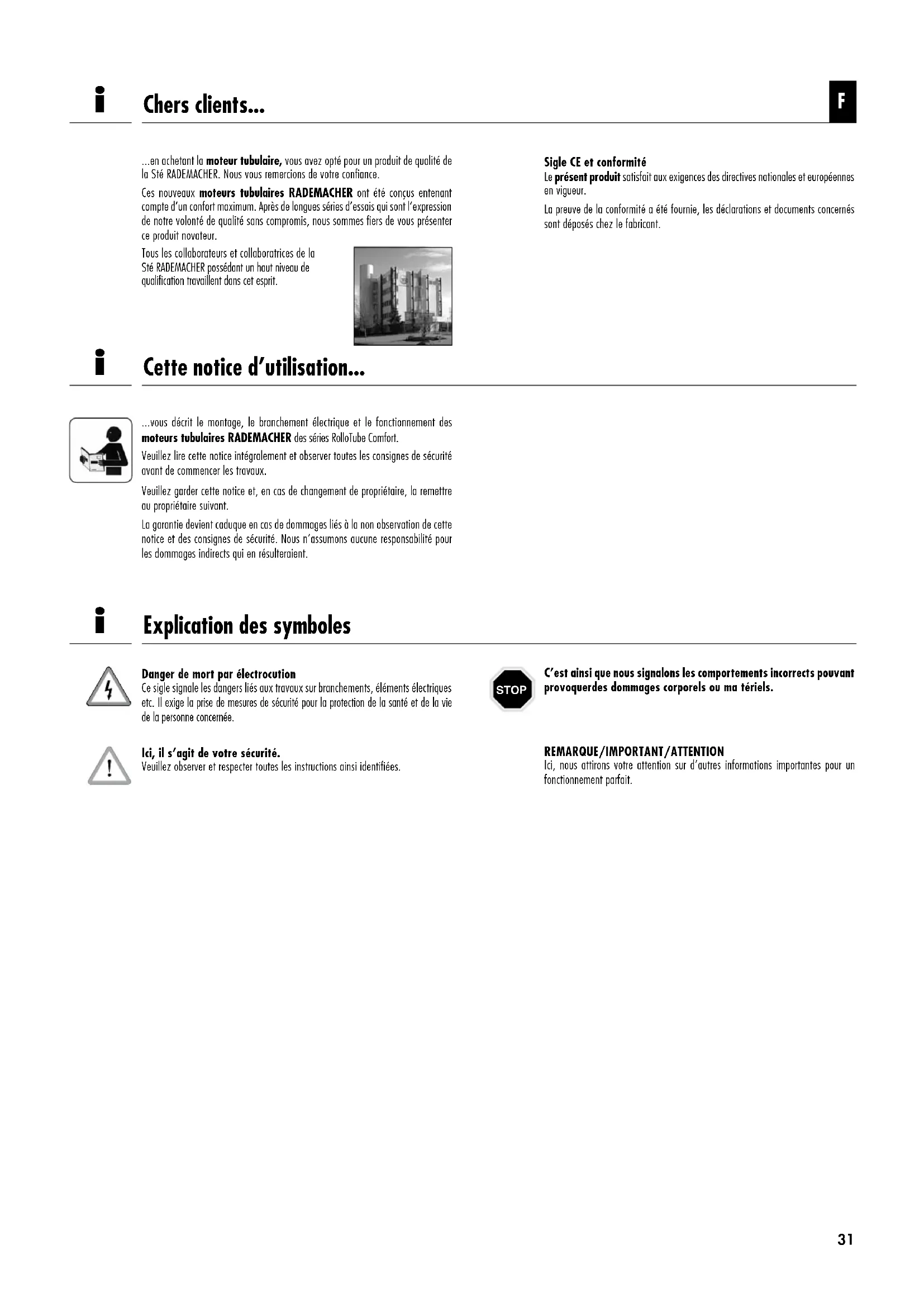 Ici, nous attirons votre attention sur d’autres informations importantes pour un fonctionnement parfait. ...vous décrit le montage, le branchement électrique et le fonctionnement des moteurs tubulaires RADEMACHER des séries RolloTube Comfort. Veuillez lire cette notice intégralement et observer toutes les consignes de sécurité avant de commencer les travaux. Veuillez garder cette notice et, en cas de changement de propriétaire, la remettre au propriétaire suivant. La garantie devient caduque en cas de dommages liés à la non observation de cette notice et des consignes de sécurité. Nous n’assumons aucune responsabilité pour les dommages indirects qui en résulteraient. STOP C’est ainsi que nous signalons les comportements incorrects pouvant provoquerdes dommages corporels ou ma tériels. F32 Consignes générales de sécurité En cas d’utilisation non conforme, il y a un risque accru de dommages corporels. ◆ Instruisez toutes les personnes concernées par une utilisation sûre du moteur tubulaire. ◆ Interdisez aux enfants de jouer avec les commandes fixes. ◆ Ne laissez pas des personnes à capacités réduites ou des enfants jouer avec les commandes fixes ou la télécommande. Volets roulants : ◆ Observer les volets roulants en mouvement et maintenir toute personne à l’écart jusqu’à ce que le mouvement soit terminé. ◆ Pour tous les travaux de nettoyage, le volet roulant doit toujours être sans tension. Auvents pouvant être mis en service en dehors du champ de vision : ◆ Ne pas mettre l’auvent en service si des travaux sont faits à proximité (nettoyage des fenêtres par exemple). Auvents à fonctionnement automatique : ◆ Débrancher l’auvent si des travaux sont faits à proximité. Une maintenance régulière des auvents augmente la sécurité de service. ◆ Vérifiez régulièrement l’équilibrage de l’auvent ainsi que l’état des câbles et des ressorts. ◆ Faites réparer les auvents endommagés par une entreprise spécialisée. Vue d’ensemble (Illustration