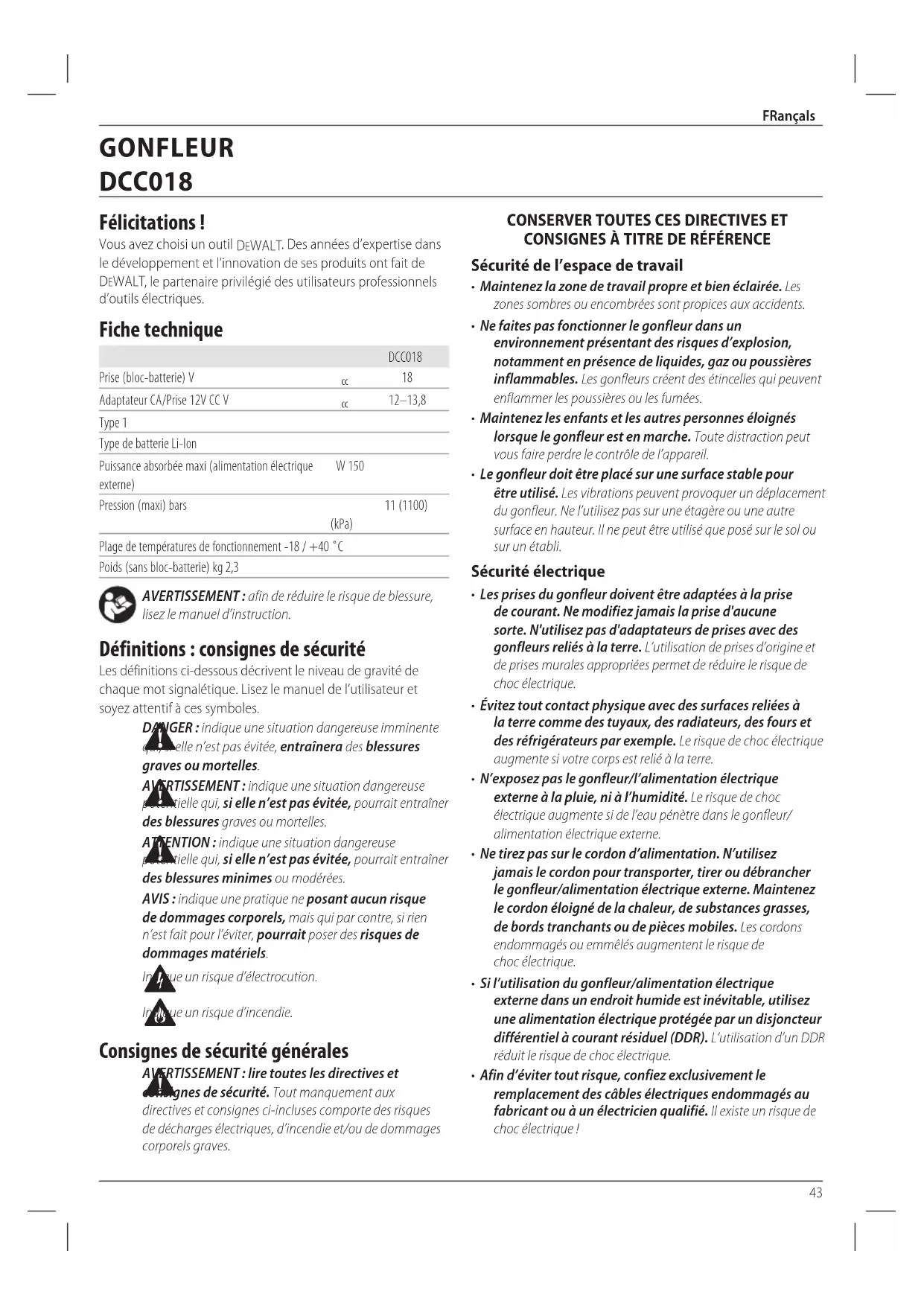 consignes de sécurité. Tout manquement aux directives et consignes ci-incluses comporte des risques de décharges électriques, d’incendie et/ou de dommages corporelsgraves. Français (traduction de la notice d’instructions originale) GONFLEUR DCC01844 FRançaIs