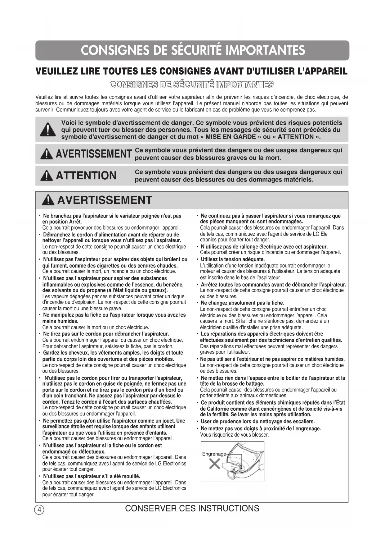 - Ne branchez pas l'aspirateur si le variateur poignée n'est pas en position Arrêt. Cela pourrait provoquer des blessures ou endommager l'appareil.• Débranchez le cordon d’alimentation avant de réparer ou de nettoyer l’appareil ou lorsque vous n’utilisez pas l’aspirateur. Le non-respect de cette consigne pourrait causer un choc électrique ou des blessures.• N'utilisez pas l'aspirateur pour aspirer des objets qui brûlent ou qui fument, comme des cigarettes ou des cendres chaudes. Cela pourrait causer la mort, un incendie ou un choc électrique.• N’utilisez pas l’aspirateur pour aspirer des substances inflammables ou explosives comme de l’essence, du benzène, des solvants ou du propane (à l'état liquide ou gazeux). Les vapeurs dégagées par ces substances peuvent créer un risque d'incendie ou d'explosion. Le non-respect de cette consigne pourrait causer la mort ou une blessure grave.• Ne manipulez pas la fiche ou l'aspirateur lorsque vous avez les mains humides. Cela pourrait causer la mort ou un choc électrique.• Ne tirez pas sur le cordon pour débrancher l’aspirateur. Cela pourrait endommager l’appareil ou causer un choc électrique. Pour débrancher l’aspirateur, saisissez la fiche, pas le cordon.• Gardez les cheveux, les vêtements amples, les doigts et toute partie du corps loin des ouvertures et des pièces mobiles. Le non-respect de cette consigne pourrait causer un choc électrique ou des blessures.• N'utilisez pas le cordon pour tirer ou transporter l'aspirateur, n'utilisez pas le cordon en guise de poignée, ne fermez pas une porte sur le cordon et ne tirez pas le cordon près d'un bord ou d'un coin tranchant. Ne passez pas l'aspirateur par-dessus le cordon. Tenez le cordon à l'écart des surfaces chauffées. Le non-respect de cette consigne pourrait causer un choc électrique ou des blessures ou endommager l'appareil.• Ne permettez pas qu'on utilise l'aspirateur comme un jouet. Une surveillance étroite est requise lorsque des enfants utilisent l'aspirateur ou que vous l'utilisez en présence d'enfants. Cela pourrait causer des blessures ou endommager l’appareil.• N’utilisez pas l’aspirateur si la fiche ou le cordon est endommagé ou défectueux. Cela pourrait causer des blessures ou endommager l'appareil. Dans de tels cas, communiquez avec l’agent de service de LG Electronics pour écarter tout danger.• N’utilisez pas l’aspirateur s’il a été mouillé. Cela pourrait causer des blessures ou endommager l’appareil. Dans de tels cas, communiquez avec l’agent de service de LG Electronics pour écarter tout danger.• Ne continuez pas à passer l'aspirateur si vous remarquez que des pièces manquent ou sont endommagées. Cela pourrait causer des blessures ou endommager l’appareil. Dans de tels cas, communiquez avec l’agent de service de LG Ele ctronics pour écarter tout danger.• N’utilisez pas de rallonge électrique avec cet aspirateur. Cela pourrait créer un risque d’incendie ou endommager l’appareil.• Utilisez la tension adéquate. L’utilisation d’une tension inadéquate pourrait endommager le moteur et causer des blessures à l'utilisateur. La tension adéquate est inscrite dans le bas de l’aspirateur.• Arrêtez toutes les commandes avant de débrancher l'aspirateur. Le non-respect de cette consigne pourrait causer un choc électrique ou des blessures.• Ne changez absolument pas la fiche. Le non-respect de cette consigne pourrait entraîner un choc électrique ou des blessures ou endommager l’appareil. Cela causera la mort. Si la fiche ne s'enfonce pas, demandez à un électricien qualifié d'installer une prise adéquate.• Les réparations des appareils électriques doivent être effectuées seulement par des techniciens d’entretien qualifiés. Des réparations mal effectuées peuvent représenter des dangers graves pour l'utilisateur. Ne pas utiliser à l’extérieur et ne pas aspirer de matières humides. Le non-respect de cette consigne pourrait causer un choc électrique ou des blessures.• Ne mettez rien dans l’espace entre le boîtier de l’aspirateur et la tête de la brosse de battage. Cela pourrait causer des blessures ou endommager l'appareil ou porter atteinte aux animaux domestiques.• Ce produit contient des éléments chimiques réputés dans l’État de Californie comme étant cancérigènes et de toxicité vis-à-vis de la fertilité. Se laver les mains après utilisation. • User de prudence lors du nettoyage des escaliers. • Ne mettez pas vos doigts à proximité de l'engrenage. Vous risqueriez de vous blesser. AVERTISSEMENT VEUILLEZ LIRE TOUTES LES CONSIGNES AVANT D'UTILISER L’APPAREIL