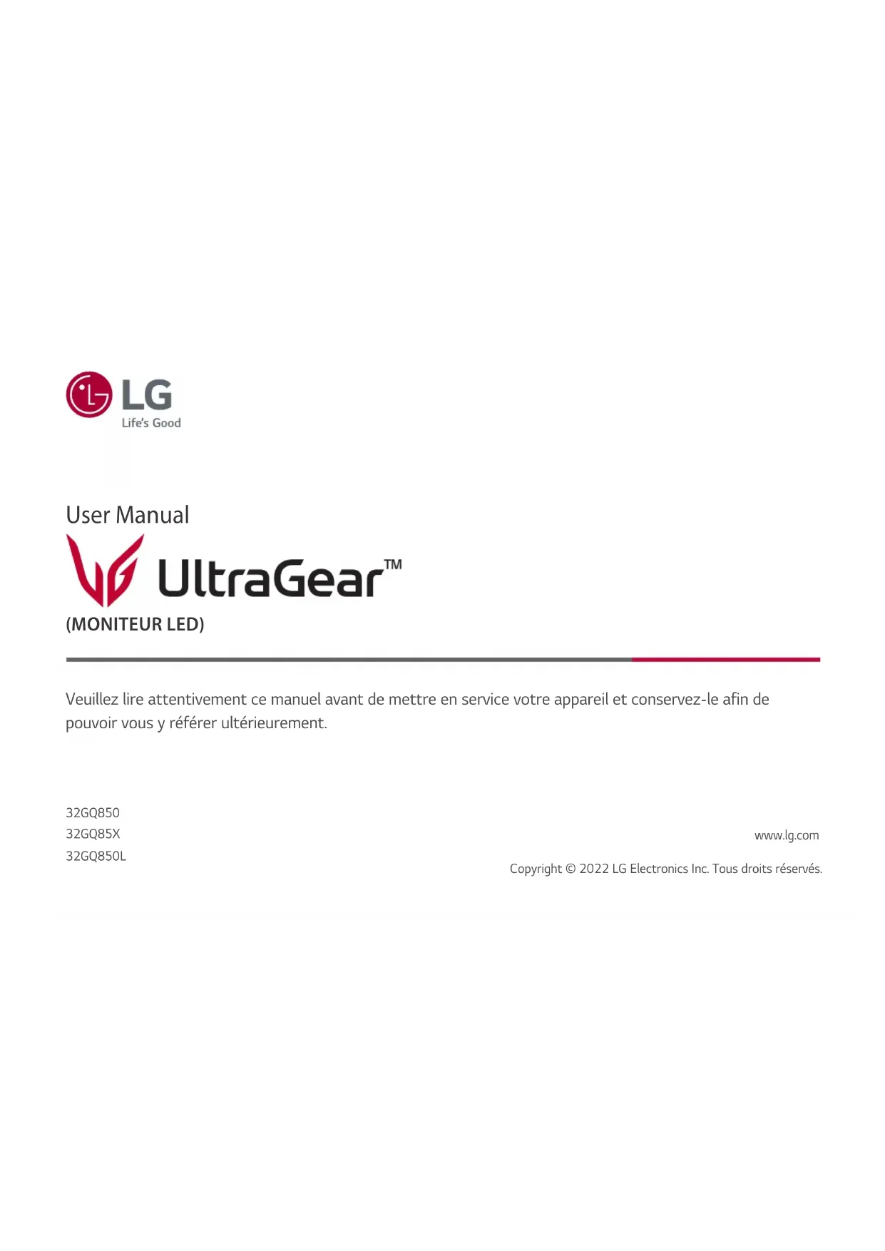(MONITEUR LED) User Manual Veuillez lire attentivement ce manuel avant de mettre en service votre appareil et conservez-le afin de pouvoir vous y référer ultérieurement. 32GQ850 32GQ85X 32GQ850L www.lg.com Copyright © 2022 LG Electronics Inc. Tous droits réservés.2 FRANÇAIS