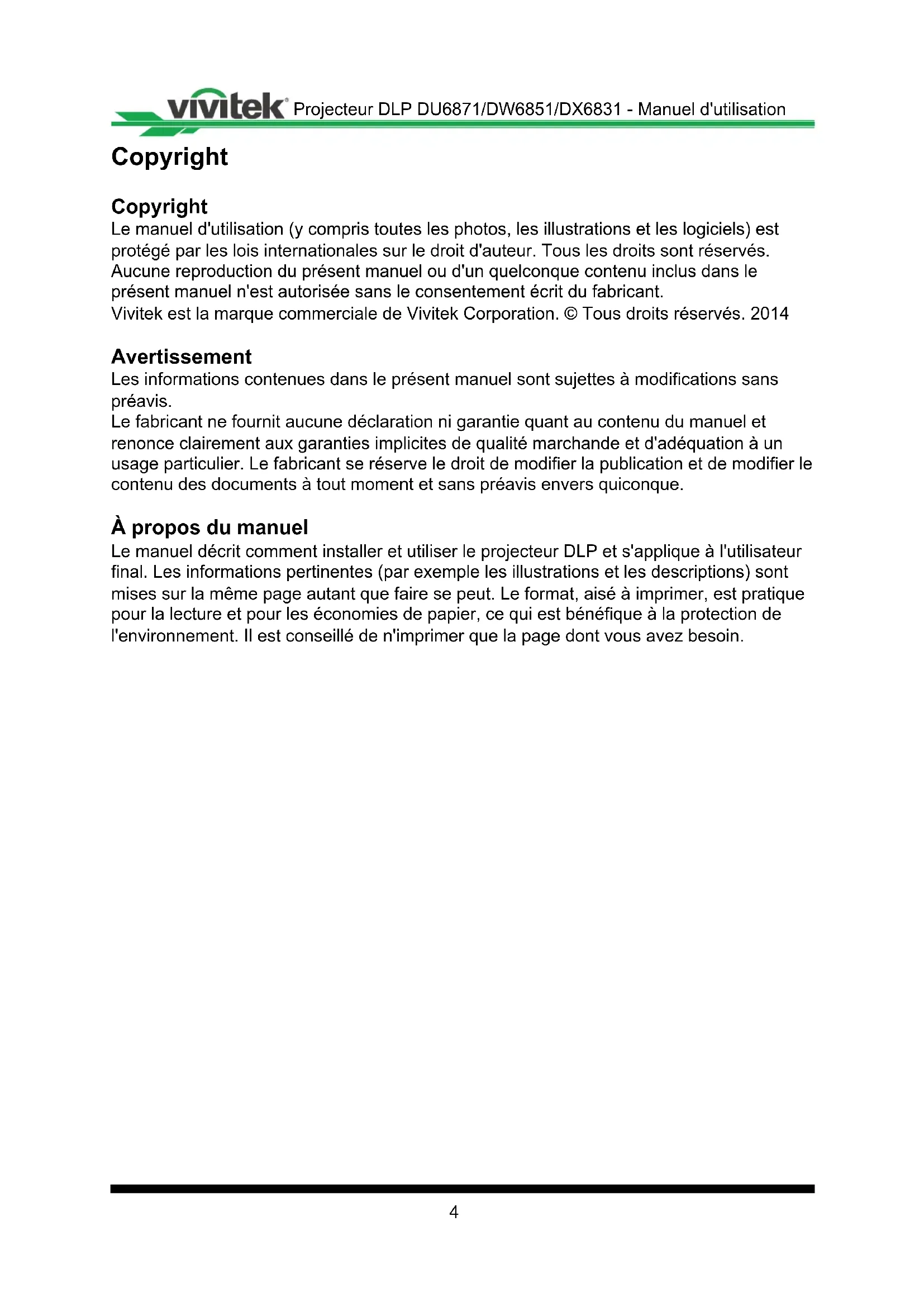 Le manuel de l'utilisateur décrit l'installation, la configuration et le fonctionnement du projecteur DU6871/DW6851/DX6831 et il offre une assistance au personnel d'installation et à l'utilisateur final pour développer pleinement les performances du projecteur. Vivitek a fait tous les efforts pour s'assurer que les informations contenues dans le présent manuel sont correctes au moment de l'impression. Le contenu peut être mis à jour fréquemment en raison de l'amélioration continue des produits et des retours des clients. Vous trouverez la première version du manuel et le manuel des autres produits Vivitek sur www.vivitekcorp.com.
