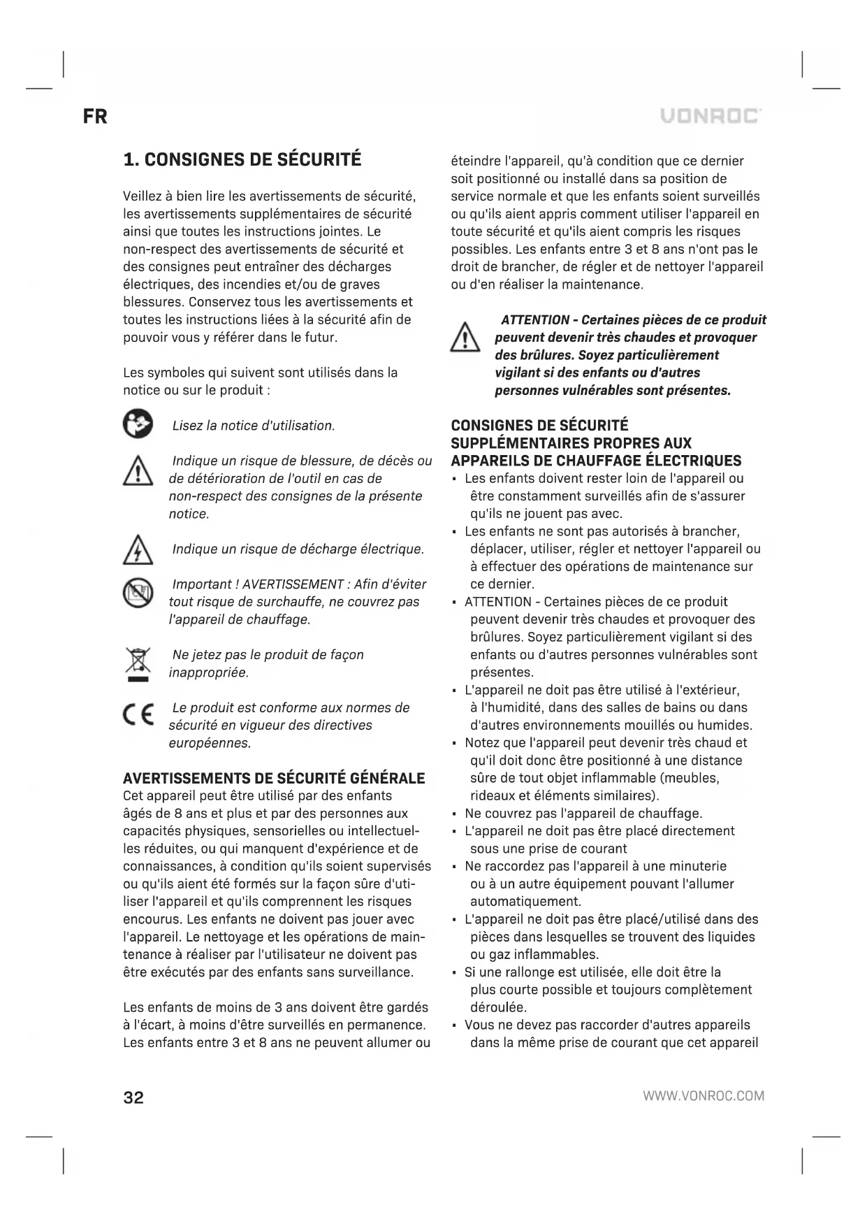 Veillez àbien lire les avertissements de sécurité, les avertissements supplémentaires de sécurité ainsi que toutes les instructions jointes. Le non-respect des avertissements de sécurité et des consignes peut entraîner des décharges électriques, des incendies et/ou de graves blessures. Conservez tous les avertissements et toutes les instructions liées àla sécurité afin de pouvoir vous yréférer dans le futur. Les symboles qui suivent sont utilisés dans la notice ou sur le produit : Lisez la notice d'utilisation. Indique un risque de blessure, de décès ou de détérioration de l'outil en cas de non-respect des consignes de la présente notice. Indique un risque de décharge électrique. Important ! AVERTISSEMENT : Afin d'éviter tout risque de surchauffe, ne couvrez pas l'appareil de chauffage. Ne jetez pas le produit de façon inappropriée. Le produit est conforme aux normes de sécurité en vigueur des directives européennes. AVERTISSEMENTS DE SÉCURITÉ GÉNÉRALE Cet appareil peut être utilisé par des enfants âgés de 8 ans et plus et par des personnes aux capacités physiques, sensorielles ou intellectuel- les réduites, ou qui manquent d'expérience et de connaissances, à condition qu'ils soient supervisés ou qu'ils aient été formés sur la façon sûre d'uti- liser l'appareil et qu'ils comprennent les risques encourus. Les enfants ne doivent pas jouer avec l'appareil. Le nettoyage et les opérations de main- tenance à réaliser par l'utilisateur ne doivent pas être exécutés par des enfants sans surveillance. Les enfants de moins de 3 ans doivent être gardés à l'écart, à moins d'être surveillés en permanence. Les enfants entre 3 et 8 ans ne peuvent allumer ou éteindre l'appareil, qu'à condition que ce dernier soit positionné ou installé dans sa position de service normale et que les enfants soient surveillés ou qu'ils aient appris comment utiliser l'appareil en toute sécurité et qu'ils aient compris les risques possibles. Les enfants entre 3 et 8 ans n'ont pas le droit de brancher, de régler et de nettoyer l'appareil ou d'en réaliser la maintenance. ATTENTION - Certaines pièces de ce produit peuvent devenir très chaudes et provoquer des brûlures. Soyez particulièrement vigilant si des enfants ou d'autres personnes vulnérables sont présentes.