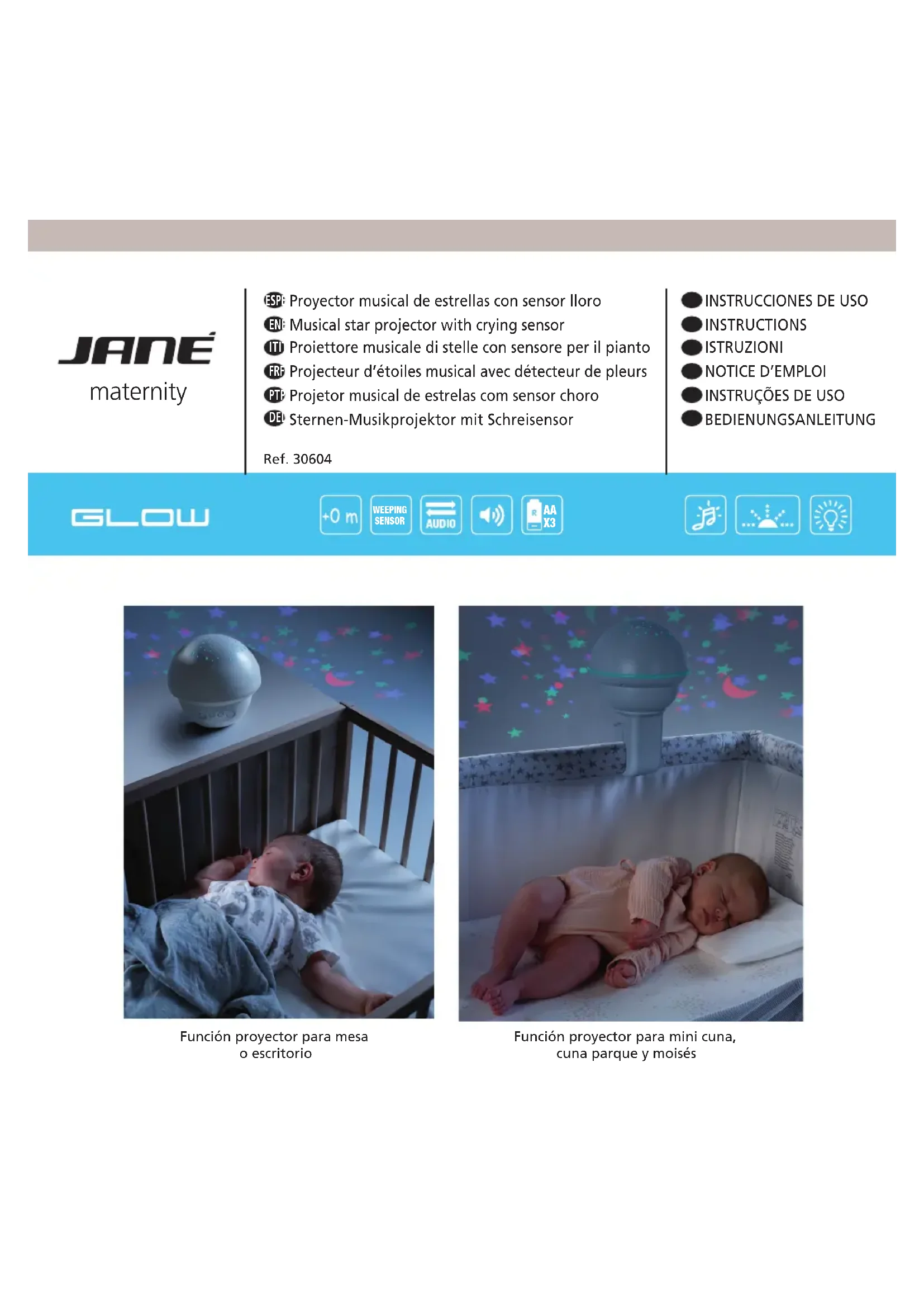 - Son accessoire doté d’une base est muni d’une pince qui permet de fixer le projecteur sur les mini-ber- ceaux, lits de cododo, parcs, lits pliants ou couffins. Le projecteur peut être également posé sur des tables et autres surfaces plates. De cette manière, vous pourrez continuer à utiliser votre projecteur d’étoiles à votre guise pour amuser ou détendre votre enfant même si vous n’utilisez plus le berceau. Vous pourrez ainsi prolonger la durée d’utilisation du produit. (Cf. informations des deux modes d’utilisation page 3) • La fixation rapide et facile du projecteur permet de l’installer immédiatement en assemblant la pince et le projecteur par un simple clic puis en le fixant sur la barre latérale du mini-berceau, lit de cododo, etc. • Contrairement aux autres projecteurs du marché, le projecteur Glow est doté d’une technologie qui permet d’obtenir une galaxie fascinante et paisible remplie d’étoiles de différentes couleurs, fixe ou dynamique, une projection de plus de 150 étoiles au plafond pour créer une ambiance calme et harmo-nieuse qui enchantera votre bébé. • Ses différentes mélodies permettront de distraire votre enfant. Il y a trois mélodies au choix et le bruit des vagues pour une détente totale. Le détecteur de pleurs du projecteur sera très utile pour les parents la nuit car il allumera une petite veilleuse qui leur offrira une intensité de lumière suffisante pour s’occu- per de leur enfant ou le faire patienter jusqu’à ce qu’ils arrivent. Cette lumière douce accompagnera également votre enfant jusqu’à ce qu’il se rendorme. • Avec « auto-off intelligent ». Cet appareil est programmé pour s’éteindre automatiquement au bout de 30 minutes, selon l’option choisie. de la même dimension. Emboîtez la pince et tournez jusqu’à ce que vous entendiez un clic d’enclenche- ment. Réglez l’ouverture de la pince au moyen de la molette pour trouver la position idéale et sûre et fixez-la sur la partie latérale de votre mini-berceau /lit de cododo, etc. Serrez fermement la pince en tour- nant la molette de réglage dans le sens contraire. Vérifiez si le projecteur est bien fixé et ne bouge plus. Une vis est également fournie pour assurer l’assemblage des deux parties (projecteur et pince) et appor- ter une double sécurité avec ce mode de fixation aux mini-berceaux (cf. dessin page 2).Note d’information de sécurité : cette vis est proposée en option pour obtenir une double sécurité et éviter que l’enfant puisse enlever le projecteur. La fixation du projecteur sans la vis offre également une excellente sécurité et elle a réussi les tests de sécurité de la norme EN-71. OPTION 2- Si vous souhaitez utiliser le projecteur sur une table ou le poser par terre dans la chambre de votre bébé, il n’est pas nécessaire d’emboîter la base de la pince sur le projecteur. Le cas échéant, retirez la pince du projecteur en la faisant tourner.RAPPEL IMPORTANTLe montage doit être réalisé par un adulte. MISE EN GARDELe non-respect des instructions peut provoquer des dommages de l’appareil ou des blessures pour l’usager.(Veuillez consulter les pages 2 et 3 pour ces instructions) :OPTION 1- Fixation sur les mini-berceaux, lits de cododo, parcs, couffins. Prenez le projecteur dans une main et la pince dans l’autre. Celle-ci est munie de deux “tenons d’assem- blage” dans la partie supérieure. La base de votre projecteur doit être munie également de deux orifices Bouton gauche jaune. Fonction projecteur • Appuyez une fois : pour la projection statique d’étoiles de différentes couleurs • Appuyez deux fois : pour la projection d’étoiles de différentes couleurs avec un léger mouvement des étoiles. • Appuyez trois fois : veilleuse + projection d’étoiles de différentes couleurs avec un léger mouvement des étoiles.