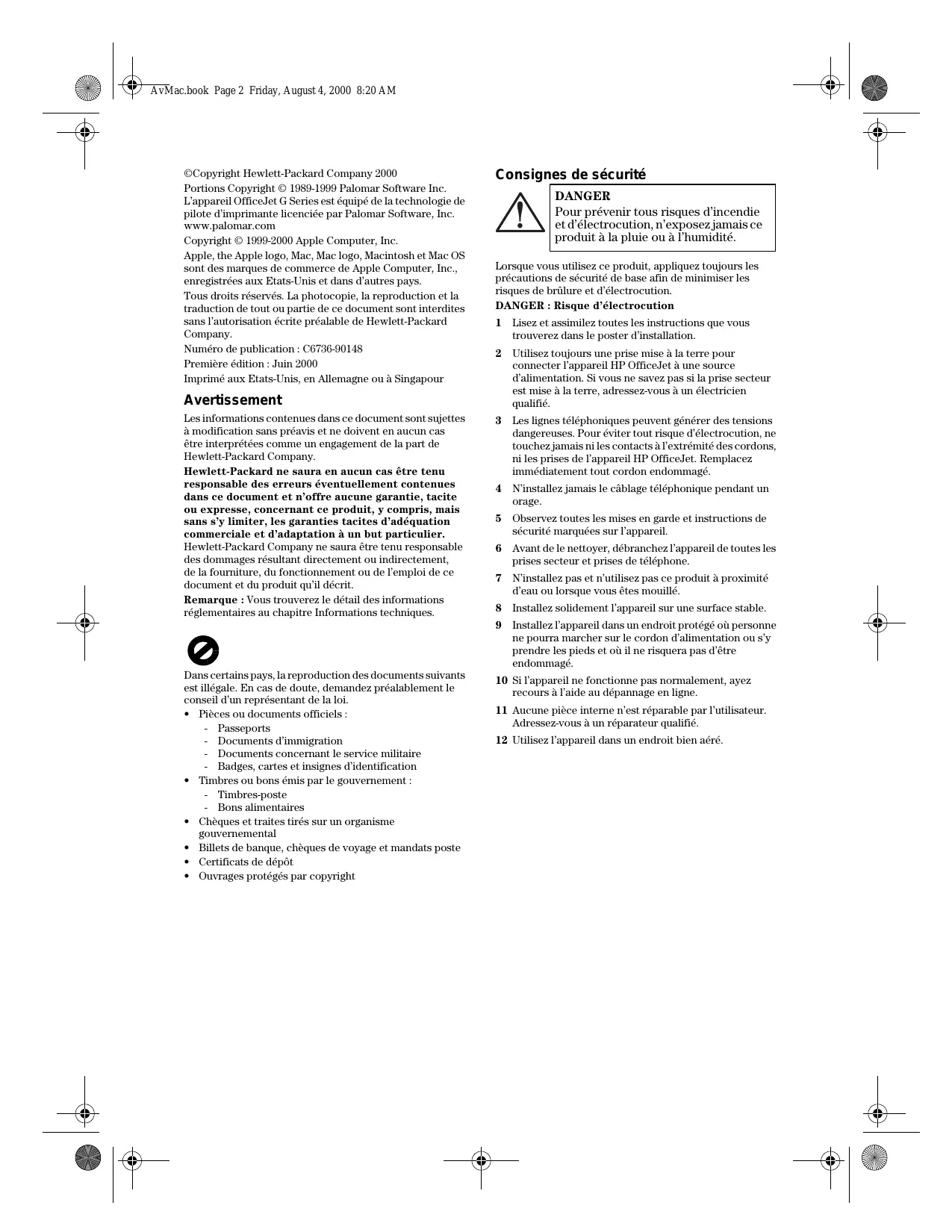 AvMac.book Page 1 Friday, August 4, 2000 8:20 AM HP OfficeJet G Series *XLGHGHEDVHSRXU0DFLQWRVK AvMac.book Page 2 Friday, August 4, 2000 8:20 AM ©Copyright Hewlett-Packard Company 2000 Portions Copyright © 1989-1999 Palomar Software Inc. Lappareil OfficeJet G Series est équipé de la technologie de pilote dimprimante licenciée par Palomar Software, Inc. www.palomar.com Copyright © 1999-2000 Apple Computer, Inc. Apple, the Apple logo, Mac, Mac logo, Macintosh et Mac OS sont des marques de commerce de Apple Computer, Inc., enregistrées aux Etats-Unis et dans dautres pays. Tous droits réservés. La photocopie, la reproduction et la traduction de tout ou partie de ce document sont interdites sans lautorisation écrite préalable de Hewlett-Packard Company. Numéro de publication : C6736-90148 Première édition : Juin 2000 Imprimé aux Etats-Unis, en Allemagne ou à Singapour Avertissement Consignes de sécurité