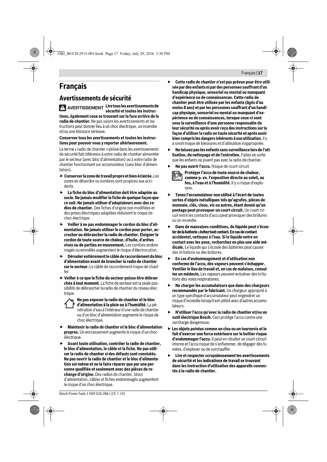 Clean the battery contacts (e.g. by inserting and remov- ing the battery several times) or replace the battery Battery pack defective Replace the battery Battery pack too warm or too cold Wait until the battery has reached operating tempera- ture Construction site radio suddenly inoperative Power-supply plug or battery pack not properly or com- pletely inserted Plug in power-supply plug or battery properly and com- pletely Bad radio reception Interference from other de- vices or insufficient set-up lo- cation Position the construction site radio at another location with better reception or with greater clearance to other electronic devices Time indication faulty Back-up batteries of clock empty Replace back-up batteries Back-up batteries incorrectly inserted (wrong polarity) Insert back-up batteries cor- rectly Cause Corrective Measure OBJ_BUCH-2915-001.book Page 15 Friday, July 29, 2016 3:30 PM16 | English 1 609 92A 2NA | (29.7.16) Bosch Power Tools Great Britain Robert Bosch Ltd. (B.S.C.) P.O. Box 98 Broadwater Park North Orbital Road Denham Uxbridge UB 9 5HJ At www.bosch-pt.co.uk you can order spare parts or arrange the collection of a product in need of servicing or repair. Tel. Service: (0344) 7360109 E-Mail: boschservicecentre@bosch.com Ireland Origo Ltd. Unit 23 Magna Drive Magna Business Park City West Dublin 24 Tel. Service: (01) 4666700 Fax: (01) 4666888 Australia, New Zealand and Pacific Islands Robert Bosch Australia Pty. Ltd. Power Tools Locked Bag 66 Clayton South VIC 3169 Customer Contact Center Inside Australia: Phone: (01300) 307044 Fax: (01300) 307045 Inside New Zealand: Phone: (0800) 543353 Fax: (0800) 428570 Outside AU and NZ: Phone: +61 3 95415555 www.bosch.com.au Republic of South Africa Customer service Hotline: (011) 6519600 Gauteng – BSC Service Centre 35 Roper Street, New Centre Johannesburg Tel.: (011) 4939375 Fax: (011) 4930126 E-Mail: bsctools@icon.co.za KZN – BSC Service Centre Unit E, Almar Centre 143 Crompton Street Pinetown Tel.: (031) 7012120 Fax: (031) 7012446 E-Mail: bsc.dur@za.bosch.com Western Cape – BSC Service Centre Democracy Way, Prosperity Park Milnerton Tel.: (021) 5512577 Fax: (021) 5513223 E-Mail: bsc@zsd.co.za Bosch Headquarters Midrand, Gauteng Tel.: (011) 6519600 Fax: (011) 6519880 E-Mail: rbsa-hq.pts@za.bosch.com Transport The contained lithium-ion batteries are subject to the Danger- ous Goods Legislation requirements. The user can transport the batteries by road without further requirements. When being transported by third parties (e.g.: air transport or forwarding agency), special requirements on packaging and labelling must be observed. For preparation of the item being shipped, consulting an expert for hazardous material is re- quired. Dispatch batteries only when the housing is undamaged. Tape or mask off open contacts and pack up the battery in such a manner that it cannot move around in the packaging. Please also observe possibly more detailed national regula- tions. Disposal Construction site radios, power-supply plugs, battery packs, accessories and packaging should be sorted for environmental-friendly recycling. Do not dispose of construction site radios, power-supply plugs and battery pack/batteries into household waste! Only for EC countries: According to the European Guideline 2012/19/EU, electrical devices/tools that are no longer usable, and according to the European Guideline 2006/66/EC, defective or used battery packs/batteries, must be collected separately and disposed of in an environmentally correct manner. Batteries no longer suitable for use can be directly returned at: Great Britain Robert Bosch Ltd. (B.S.C.) P.O. Box 98 Broadwater Park North Orbital Road Denham Uxbridge UB 9 5HJ At www.bosch-pt.co.uk you can order spare parts or arrange the collection of a product in need of servicing or repair. Tel. Service: (0344) 7360109 E-Mail: boschservicecentre@bosch.com Battery packs/batteries: Li-ion: Please observe the instructions in sec- tion “Transport”, page 16. Subject to change without notice. OBJ_BUCH-2915-001.book Page 16 Friday, July 29, 2016 3:30 PMFrançais | 17 Bosch Power Tools 1 609 92A 2NA | (29.7.16) Français Avertissements de sécurité Lire tous les avertissements de sécurité et toutes les instruc- tions, également ceux se trouvant sur la face arrière de la radio de chantier. Ne pas suivre les avertissements et ins- tructions peut donner lieu à un choc électrique, un incendie et/ou une blessure sérieuse. Conserver tous les avertissements et toutes les instruc- tions pour pouvoir vous y reporter ultérieurement. Le terme « radio de chantier » utilisé dans les avertissements de sécurité fait référence à votre radio de chantier alimentée par le secteur (avec bloc d’alimentation) ou à votre radio de chantier fonctionnant sur accumulateur (sans bloc d’alimen- tation). Conserver la zone de travail propre et bien éclairée. Les zones en désordre ou sombres sont propices aux acci- dents. La fiche du bloc d’alimentation doit être adaptée au socle. Ne jamais modifier la fiche de quelque façon que ce soit. Ne jamais utiliser d’adaptateurs avec des ra- dios de chantier. Des fiches d’origine non modifiées et des prises électriques adaptées réduisent le risque de choc électrique. Veiller à ne pas endommager le cordon du bloc d’ali- mentation. Ne jamais utiliser le cordon pour porter, ac- crocher ou débrancher la radio de chantier. Eloigner le cordon de toute source de chaleur, d’huile, d’arêtes vives ou de parties en mouvement. Les cordons endom- magés ou emmêlés augmentent le risque d’électrocution. Dérouler entièrement le câble de raccordement du bloc d’alimentation avant de brancher la radio de chantier sur le secteur. Le câble de raccordement risque de chauf- fer. Veiller à ce que la fiche du secteur puisse être débran- chée à tout moment. La fiche de secteur est la seule pos- sibilité de débrancher la radio de chantier du réseau élec- t