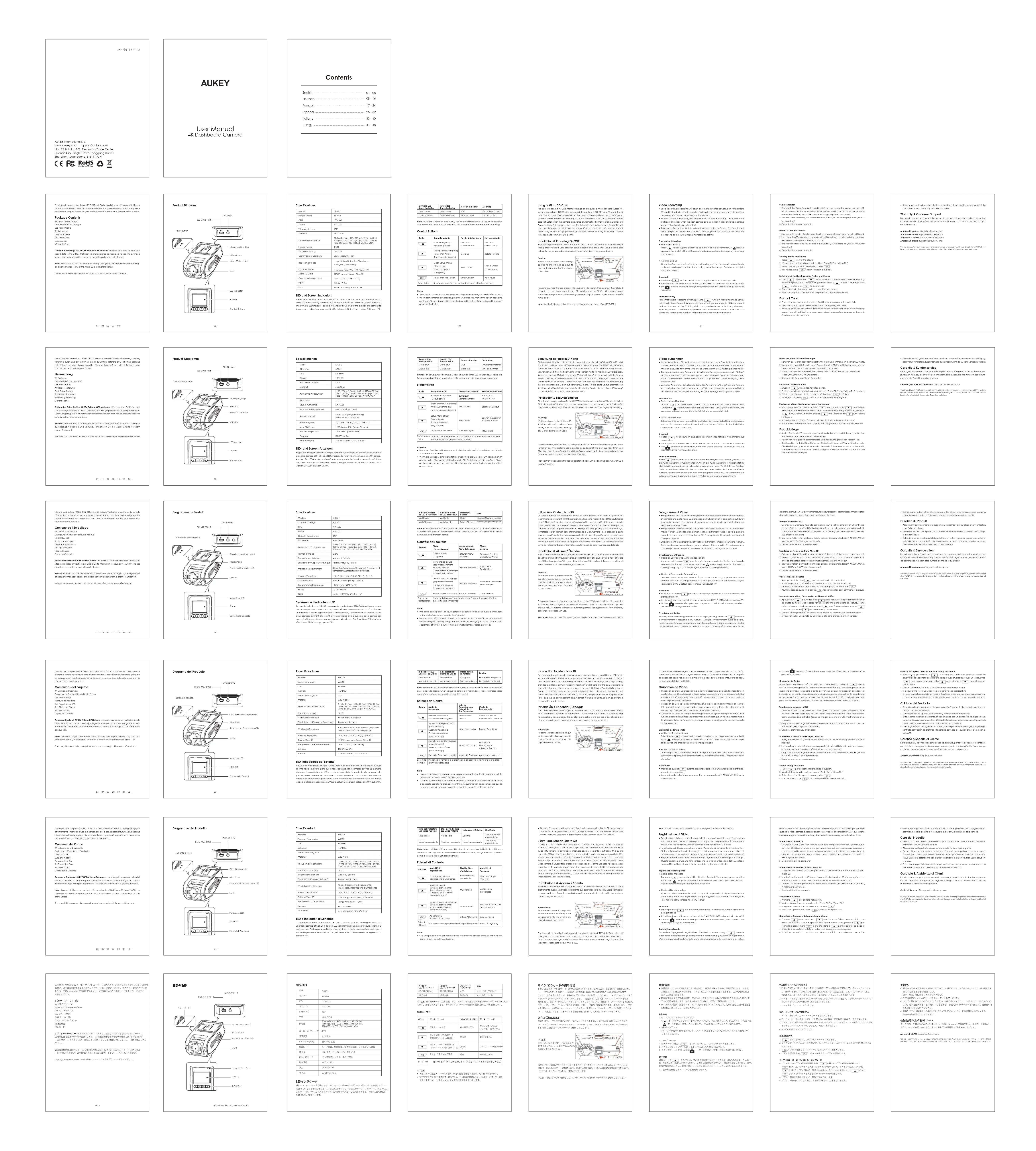 157° ABS, Glass2160p (24 fps), 1440p (30 fps), 1296p (30 fps), 1080p (60 fps), 1080p (30 fps), 720p (120 fps), 720p (60 fps), 720p (30 fps), WVGA, VGA JPEG On / Off Low / Medium / HighLoop, Motion Detection, Time-Lapse, Emergency Recording-1.0, -2/3, -1/3, +0.0, +1/3, +2/3, +1.0128GB support (Max), Class 10-30°C – 75°C (-22°F – 167°F)DC 5V 1A–2A77 x 51 x 37mm / 3" x 2" x 1.45" - 06 - Video Recording ● Loop Recording: Recording will begin automatically after powering on with a micro SD card in the device. Each recorded file is up to ten minutes long, with old footage being replaced when micro SD card storage is full.● Motion Detection Recording: Switch on motion detection in ‘Setup.’ This function will start recording video when the dash camera detects motion in front and stop recording when motion is no longer detected. ● Time-Lapse Recording: Switch on time-lapse recording in ‘Setup.’ This function will capture a picture per second to make a video played at the same number of frames per second as the current recording resolution setting.Emergency Recording● Manual File Backup Press to back up the current file so that it will not be overwritten. A icon will appear in the top left of the LCD screen to indicate a protected emergency recording is in progress.● Auto File Backup Once the G-sensor is activated by a sudden impact, the device will automatically make a recording and protect it from being overwritten. Adjust G-sensor sensitivity in the ‘Setup’ menu.Snapshot● Hold down for 3 seconds to take a snapshot while in recording mode ● The snapshot files are located in the \ AUKEY\PHOTO folder on the micro SD card ● The icon will be shown after you take a snapshot. This will not interrupt the video recordingAudio RecordingTurn on/off audio recording by long-pressing when in recording mode (or by adjusting in ‘Setup’ menu). When audio recording is on, in-car audio will be recorded during video recording. Voicing details of possible hazards that may develop, especially when off-camera, may provide useful information. You can even use it to record car license plate numbers that may not be captured on the video.- 04 - ● Keep important videos and photos backed up elsewhere to protect against file corruption or loss caused by any SD card issues Warranty & Customer Support For questions, support, or warranty claims, please contact us at the address below that corresponds with your region. Please include your Amazon order number and product model number.Amazon US orders: support.us@aukey.com Amazon EU orders: support.eu@aukey.com Amazon CA orders: support.ca@aukey.comAmazon JP orders: support.jp@aukey.com *Please note, AUKEY can only provide after sales service for products purchased directly from AUKEY. If you have purchased from a different seller, please contact them directly for service or warranty issues. - 09 - - 11 - - 12 - - 13 - - 14 - - 15 - - 16 - Spezifikationen ModellBildsensor CPU DisplayWeitwinkel-ObjektivMaterialAufnahme-AuflösungenBildformatSound-AufnahmeSensitivität des G-SensorsAufnahmemodiBelichtungswertMicroSD-KarteBetriebstemperaturEingangAbmessungenDR02 JAR0521NT966601,5" LCD 157° ABS, Glas2160p (24 fps), 1440p (30 fps), 1296p (30 fps), 1080p (60 fps), 1080p (30 fps), 720p (120 fps), 720p (60 fps), 720p (30 fps), WVGA, VGA JPEG Ein / Aus Niedrig / Mittel / HöheLoop, Bewegungserkennung, Zeitraffer, Notaufnahme-1,0, -2/3, -1/3, +0,0, +1/3, +2/3, +1,0128GB unterstützt (Max). Class 10-30°C–75°C (-22°F–167°F)DC 5V 1A–2A77 x 51 x 37mm / 3" x 2" x 1,45" Benutzung der microSD-Karte Die Kamera erhält keinen internen Speicher und erfordert eine microSD-Karte (Class 10+ wird empfohlen, und bis zu max. 128GB unterstützt) zum Funktionieren. Eine 128GB microSD-Karte kann 5 Stunden für 4K Aufnahmen oder 16 Stunden für 1080p Aufnahmen speichern. Verwenden Sie bitte eine hochwertige und Marken-Karte für maximale Zuverlässigkeit.Stecken Sie die microSD-Karte in den microSD-Karte-Slot von Frontkamera ein. Als die Kamera eingeschaltet wird, formatieren Sie die Karte (“Format” Option in “Einstellungen” der Dashcam) um die Karte für den ersten Gebrauch in der Dashcam vorzubereiten. Die Formatierung löscht permanent alle Daten auf der microSD-Karte. Für die beste Leistung formatieren Sie bitte regelmäßig die Karte (nachdem Sie alle wichtige Dateien sichern). “Format-Warnung” in “Einstellungen” wird Sie erinnern, um dies zu tun Installation & Ein/Ausschalten Für optimale Leistung, installieren Sie die AUKEY DR02 J an der oberen Mitte der Windschutzscheibe. Die Richtung des Objektivs kann nach oben und unten angepasst werden. Befestigen Sie das Netzkabel mithilfe von Kabelklemmen bequem und sicher, wie in der folgenden Abbildung.Achtung: Wir übernehmen keine Haftung für Schäden, die aufgrund von dem Airbag oder von falscher Platzierung des Geräts oder dessen Kabel ● Sichern Sie wichtige Videos und Fotos an einem anderen Ort, um sie vor Beschädigung oder Verlust von Dateien zu schützen, die durch Probleme mit der SD-Karte verursacht werden Garantie & Kundenservice Bei Fragen, Problemen oder Garantieansprüchen kontaktieren Sie uns bitte unter der jeweiligen Adresse, die Ihrer Region entspricht. Bitte geben Sie Ihre Amazon-Bestellnum-mer und die Produktmodellnummer an.Bestellungen über Amazon Europa: support.eu@aukey.com * Wichtiger Hinweis: AUKEY bietet nur für die Produkte einen Kundenservice an, die direkt bei AUKEY erworben wurden. Sollten Sie Ihr Produkt bei einem anderen Händler gekauft haben, kontaktieren Sie bitte dessen Kundendienst bezüglich Fragen oder Garantieansprüchen.- 17 - - 19 - - 20 - - 21 - - 22 - - 23 - - 24 -Merci d’avoir acheté AUKEY DR02 J Caméra de Voiture. Veuillez lire attentivement ce mode d’emplois et le conserver pour référence future. Si vous avez besoin des aides, veuillez contacter notre équipe de service client avec le numéro du modèle et votre numéro de comm