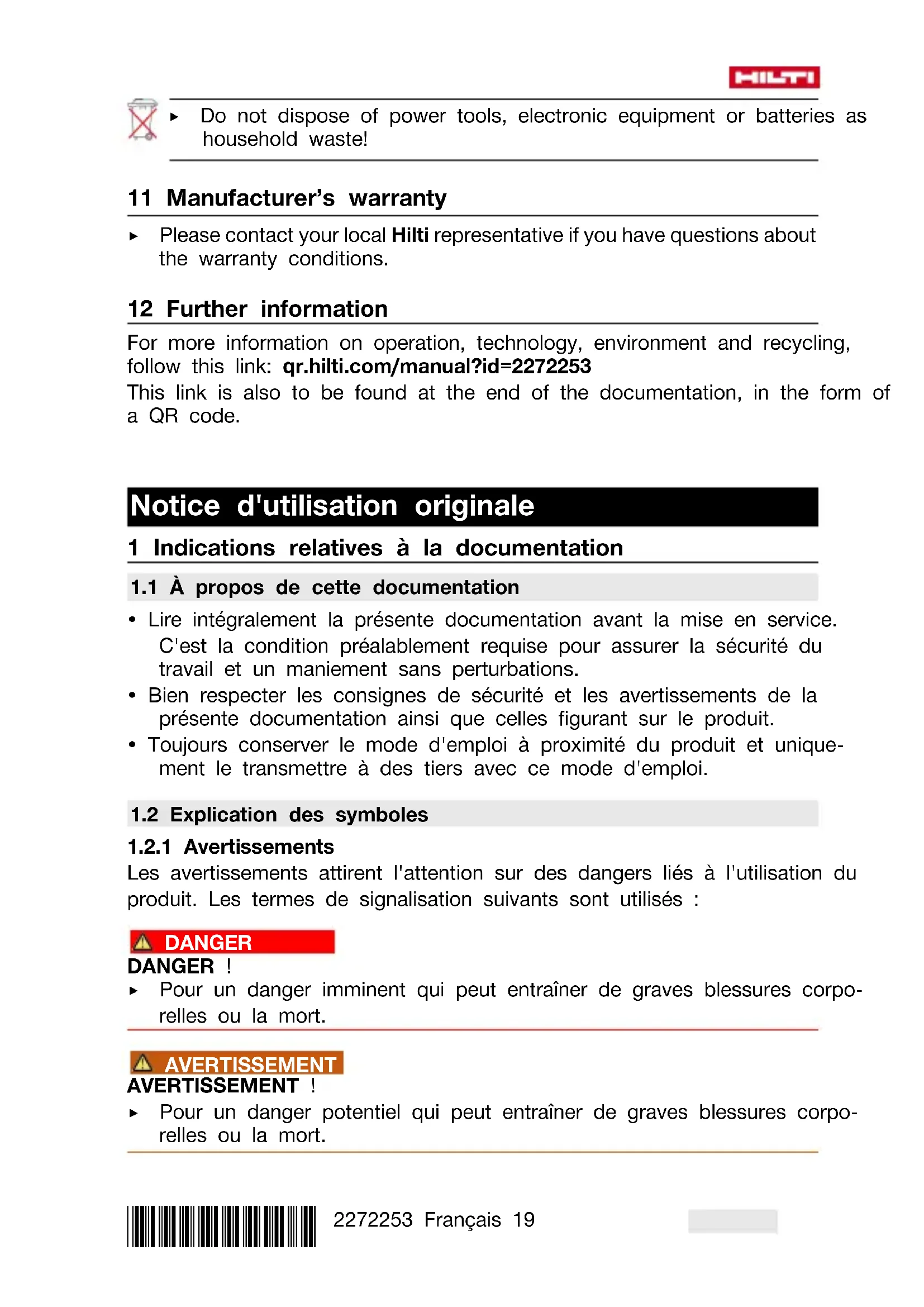 - Après des travaux de nettoyage et d'entretien, vérifier si tous les équi- pements de protection sont bien en place et fonctionnent parfaitement. Pour une utilisation en toute sécurité, utiliser uniquement des pièces de rechange et consommables d'origine. Vous trouverez les pièces de rechange, consommables et accessoires autorisés par Hilti convenant pour votre produit dans le centre Hilti Store ou sous : www.hilti.group*2272253* 2272253 Français 37 8 Transport et stockage des outils sur accu et des accus Transport ATTENTION Mise en marche inopinée lors du transport ! ▶ Toujours retirer les accus avant de transporter les produits ! ▶ Retirer le ou les accus. ▶ Ne jamais transporter les accus en vrac. Pendant le transport, les accus doivent être protégés des vibrations et chocs excessifs, isolés de tout matériau conducteur ou autre accu, pour éviter qu'ils n'entrent en contact avec d'autres pôles de batterie et qu'ils provoquent un court- circuit. Tenir compte des prescriptions locales pour le transport d'accus. ▶ Ne pas envoyer les accus par la poste. S'adresser à un service d'expédition s'il faut envoyer des accus non endommagés. ▶ Contrôler l'état du produit et des accus avant chaque utilisation, ainsi qu'avant et après tout transport prolongé. Stockage AVERTISSEMENT Endommagement involontaire du fait d'accus défectueux ou de chute d'accu ! ▶ Toujours retirer les accus avant de stocker les produits ! ▶ Stocker si possible le produit et les accus dans un endroit sec et frais. Respecter les valeurs limites de température indiquées dans les caractéristiques techniques. ▶ Ne pas stocker les accus sur le chargeur. Retirer toujours l'accu du chargeur après la charge. ▶ Ne jamais stocker les accus exposés au soleil, sur des sources de chaleur ou derrière des vitres. ▶ Stocker le produit et les accus à l'abri des enfants et des personnes non autorisées. ▶ Contrôler l'état du produit et des accus avant chaque utilisation, ainsi qu'avant et après tout stockage prolongé. 9 Aide au dépannage Pour toutes les défaillances, tenir compte de l'indicateur d'état de charge et d'erreurs de l'accu. Voir le chapitre Affichages de l'accu Li-Ion. En cas de défaillances non énumérées dans ce tableau ou auxquelles il n'est pas possible de remédier sans aide, contacter le S.A.V. Hilti. Défaillance Causes possibles Solution Le produit ne fonc- tionne pas. L'accu n'est pas com- plètement encliqueté. ▶ Encliqueter l'accu d'un clic audible.38 Français 2272253 *2272253* Défaillance Causes possibles Solution Le produit ne fonc- tionne pas. L'accu est déchargé. ▶ Remplacer l'accu et charger l'accu vide. Impossible d'enfon- cer le variateur élec- tronique de vitesse ou le variateur est bloqué. Inverseur du sens de rotation droite / gauche sur la position médiane. ▶ Pousser l'inverseur du sens de rotation droite / gauche vers la gauche ou la droite. L'accu se vide plus rapidement que d'habitude. Température ambiante très basse. ▶ Laisser l'accu se réchauffer lentement à la température de service. L'accu ne s'encli- quette pas avec un clic audible. Ergot d'encliquetage encrassé sur l'accu. ▶ Nettoyer l'ergot d'en- cliquetage et encli- queter l'accu dans son logement. Si le problème persiste, contacter le S.A.V. Hilti. Important dégage- ment de chaleur dans le produit ou dans l'accu. Défaut électrique. ▶ Arrêter immédiate- ment le produit, sortir l'accu et l'examiner, le laisser refroidir et contacter le S.A.V. Hilti. Les DEL de l'accu n'indiquent rien L'accu est défectueux ▶ S'adresser au S.A.V. Hilti. 10 Recyclage AVERTISSEMENT Risque de blessures en cas d'élimination incorrecte ! Émanations possibles de gaz et de liquides nocives pour la santé. ▶ Ne pas envoyer ni expédier d'accus endommagés ! ▶ Recouvrir les raccordements avec un matériau non conducteur pour éviter tout court-circuit. ▶ Éliminer les accus en veillant à ce qu'ils soient hors de la portée des enfants. ▶ Éliminer l'accu en le déposant auprès du Hilti Store local ou s'adresser à l'entreprise de collecte des déchets compétente. Les produits Hilti sont fabriqués pour une grande partie en matériaux recyclables. Le recyclage présuppose un tri adéquat des matériaux. Hilti*2272253* 2272253 Español 39 reprend les appareils usagés dans de nombreux pays en vue de leur recyclage. Consulter le service clients Hilti ou un conseiller commercial. ▶ Ne pas jeter les appareils électriques, électroniques et accus dans les ordures ménagères ! 11 Garantie constructeur ▶ En cas de questions sur les conditions de garantie, veuillez vous adresser à votre partenaire Hilti local. 12 Informations complémentaires Des informations complémentaires concernant l'utilisation, la technique, l'environnement et le recyclage sont disponibles sous le lien ci-dessous : qr.hilti.com/manual?id=2272253 Ce lien figure également à la fin de la documentation sous forme de code QR. Manual de instrucciones original 1 Información sobre la documentación