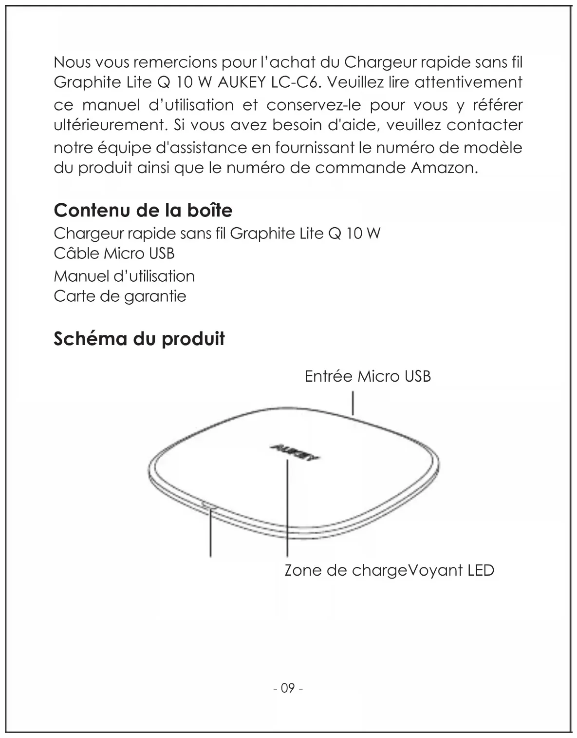 Nous vous remercions pour l'achat du Chargeur rapide sans fil Graphite Lite Q 10 W AUKEY LC-C6. Veuillez lire attentivement ce manuel d'utilisation et conservez-le pour vous y référer ultérieurement. Si vous avez besoin d'aide, veuillez contacter notre équipe d'assistance en fournissant le numéro de modèle du produit ainsi que le numéro de commande Amazon.