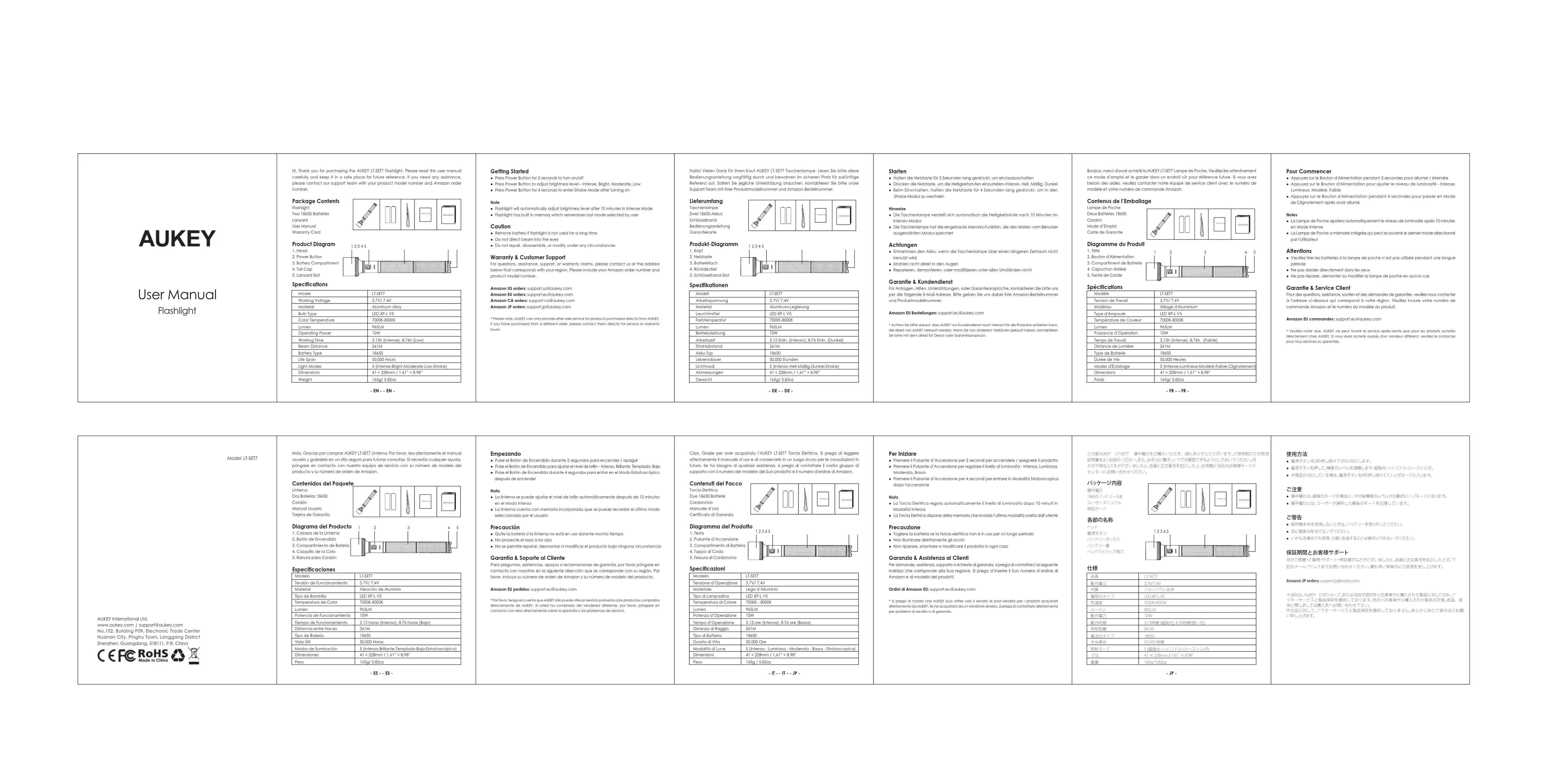 50,000 Heures 5 (Intense-Lumineux-Modéré-Faible-Clignotement) 41 × 228mm / 1,61” × 8,98” 165g/ 5,82oz Pour Commencer ● Appuyez sur le Bouton d'Alimentation pendant 2 secondes pour allumer / éteindre ● Appuyez sur le Bouton d'Alimentation pour ajuster le niveau de luminosité - Intense, Lumineux, Modéré, Faible ● Appuyez sur le Bouton d'Alimentation pendant 4 secondes pour passer en Mode de Clignotement après avoir allumé Notes ● La Lampe de Poche ajustera automatiquement le niveau de luminosité après 10 minutes en Mode Intense ● La Lampe de Poche a mémoire intégrée,qui peut se soutenir le dernier mode sélectionné par l'utilisateur Attentions ● Veuillez tirer les batteries si la lampe de poche n’est pas utilisée pendant une longue période ● Ne pas darder directement dans les yeux ● Ne pas réparer, démonter ou modifier la lampe de poche en aucun cas Garantie & Service Client Pour des questions, assistance, soutien et des demandes de garanties, veuillez nous contacter à l'adresse ci-dessous qui correspond à votre région. Veuillez inclure votre numéro de commande Amazon et le numéro du modèle du produit. Amazon EU commandes: support.eu@aukey.com