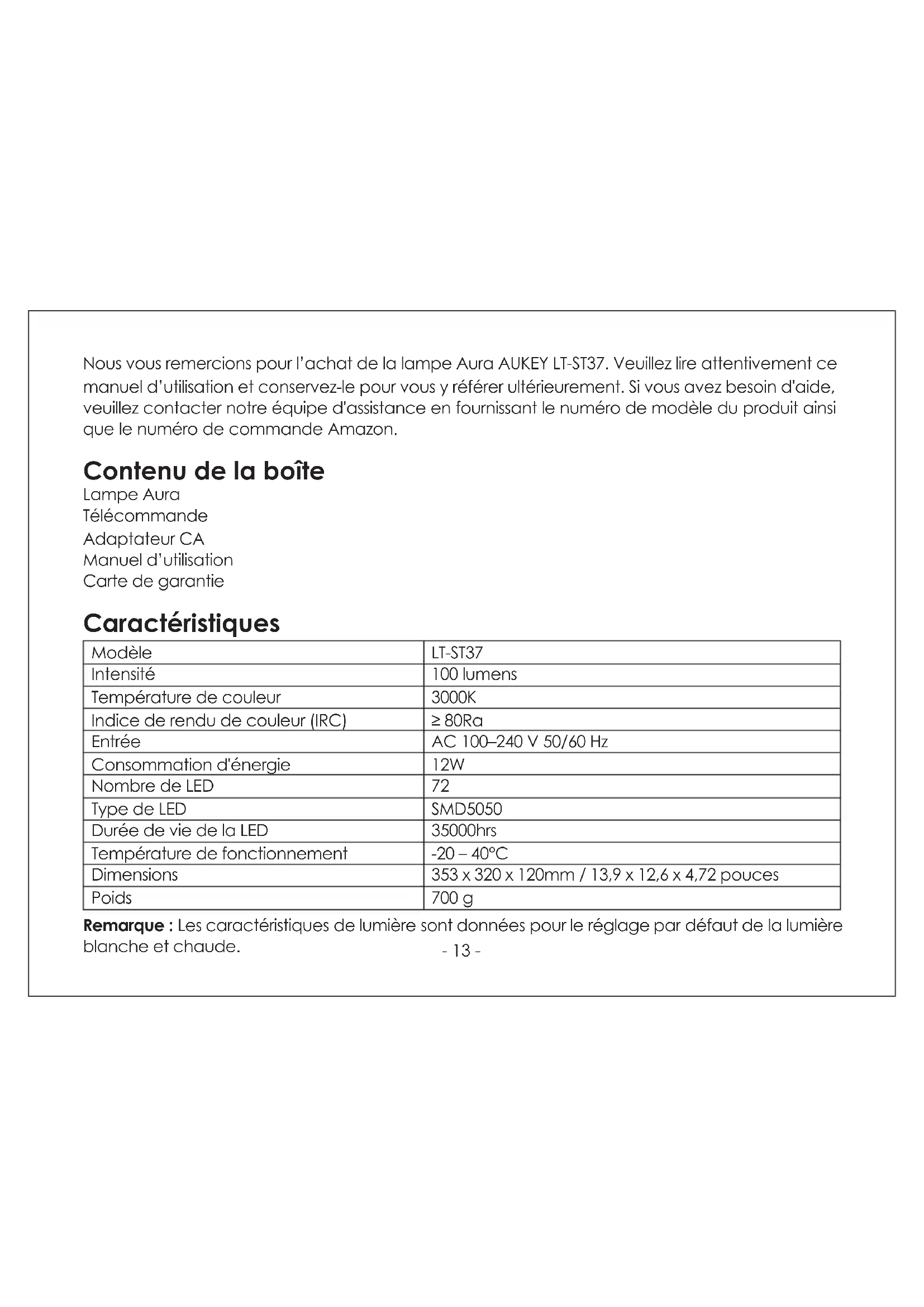 - Wichtiger Hinweis: AUKEY bietet nur für die Produkte einen Kundenservice an, die direkt bei AUKEY erworben wurden. Sollten Sie Ihr Produkt bei einem anderen Händler gekauft haben, kontaktieren Sie bitte dessen Kundend- ienst bezüglich Fragen oder Garantieansprüchen.- 13 - Nous vous remercions pour l’achat de la lampe Aura AUKEY LT-ST37. Veuillez lire attentivement ce manuel d’utilisation et conservez-le pour vous y référer ultérieurement. Si vous avez besoin d'aide, veuillez contacter notre équipe d'assistance en fournissant le numéro de modèle du produit ainsi que le numéro de commande Amazon. Contenu de la boîte Lampe Aura Télécommande Adaptateur CA Manuel d’utilisation Carte de garantie Caractéristiques Modèle Intensité Température de couleur Indice de rendu de couleur (IRC) Entrée Consommation d'énergie Nombre de LED Type de LED Durée de vie de la LED Température de fonctionnement Dimensions Poids LT-ST37 100 lumens 3000K ≥80Ra AC 100–240V 50/60Hz 12W